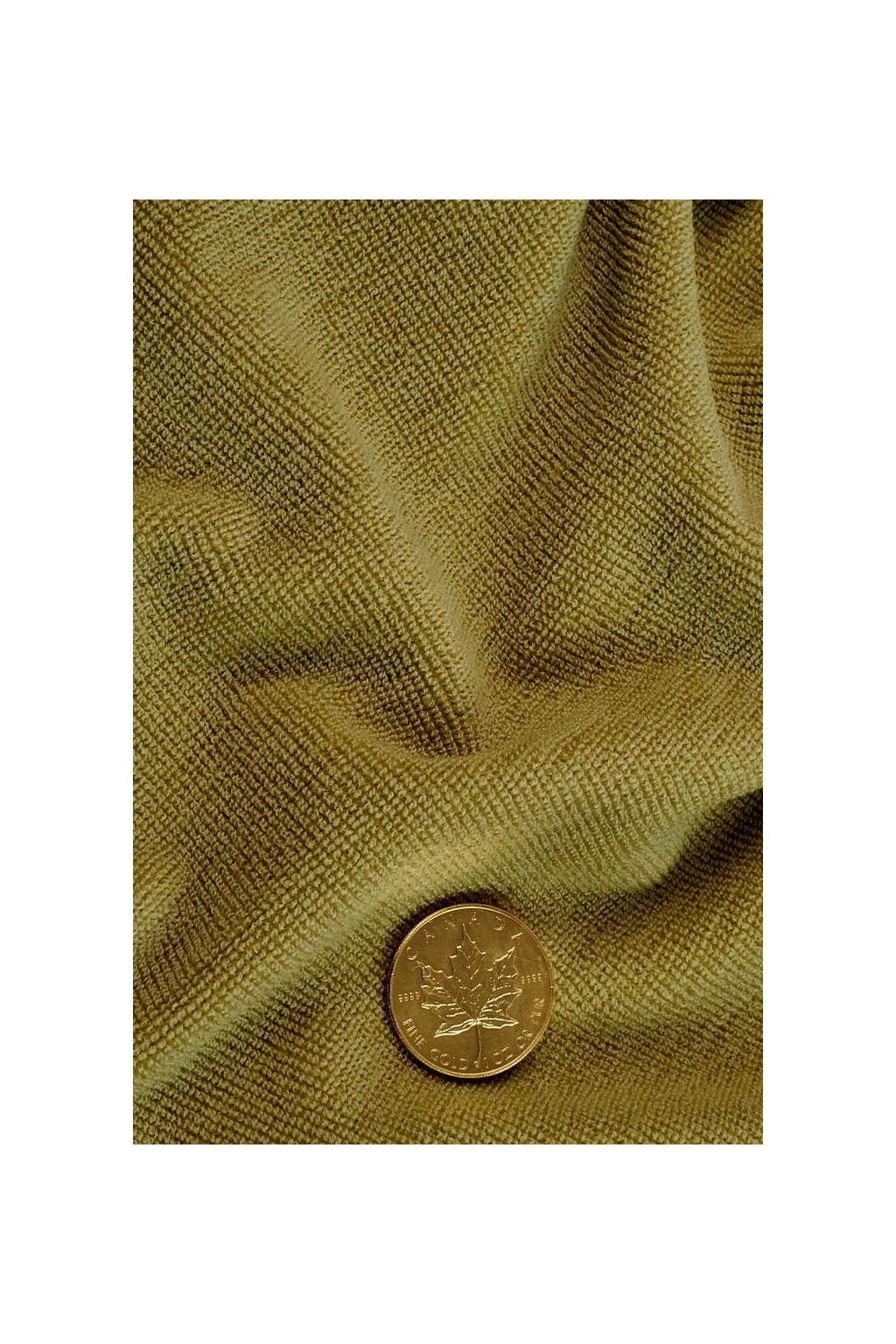 Kvalitní mohérová potahová látka olivové s jemným nádechem žluté barvy. Má lesklý hedvábný luxusní vzhled.