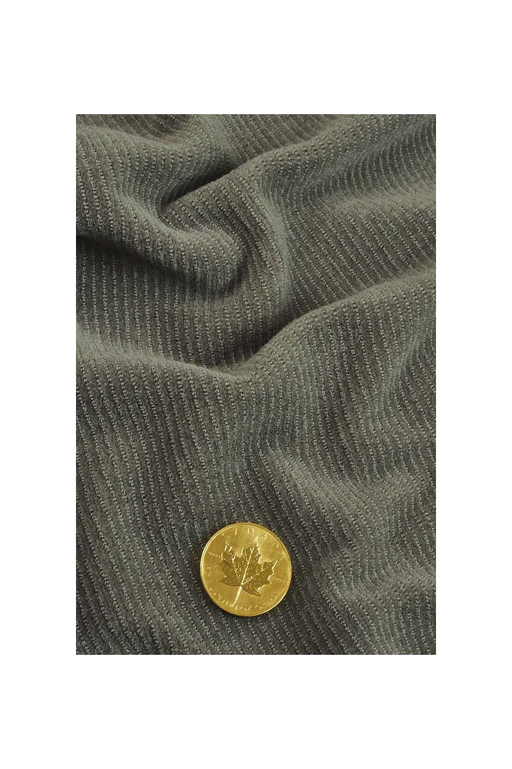 Kvalitní potahová látka tmavě khaki barvy se vzorem drobných pruhů.