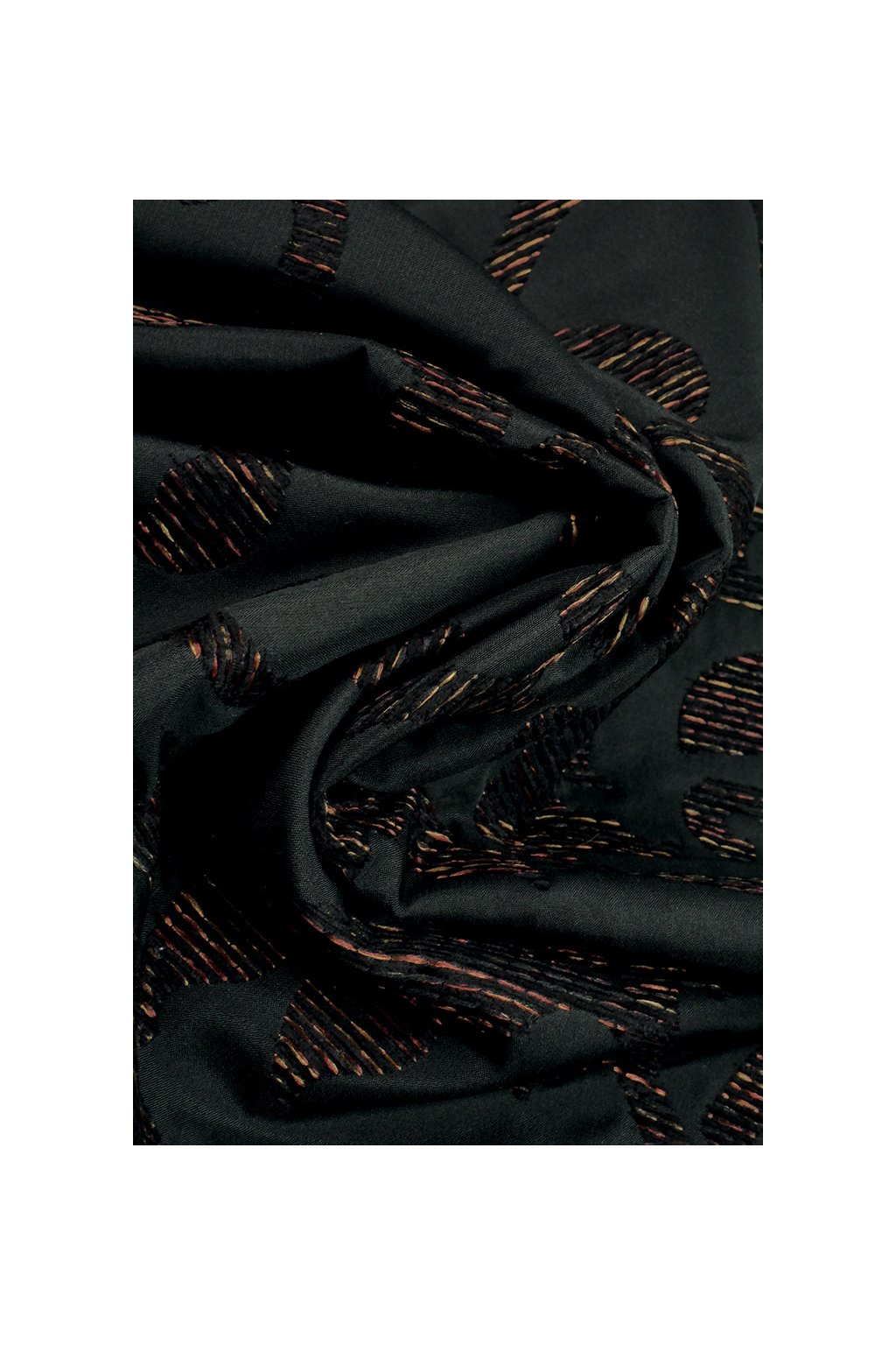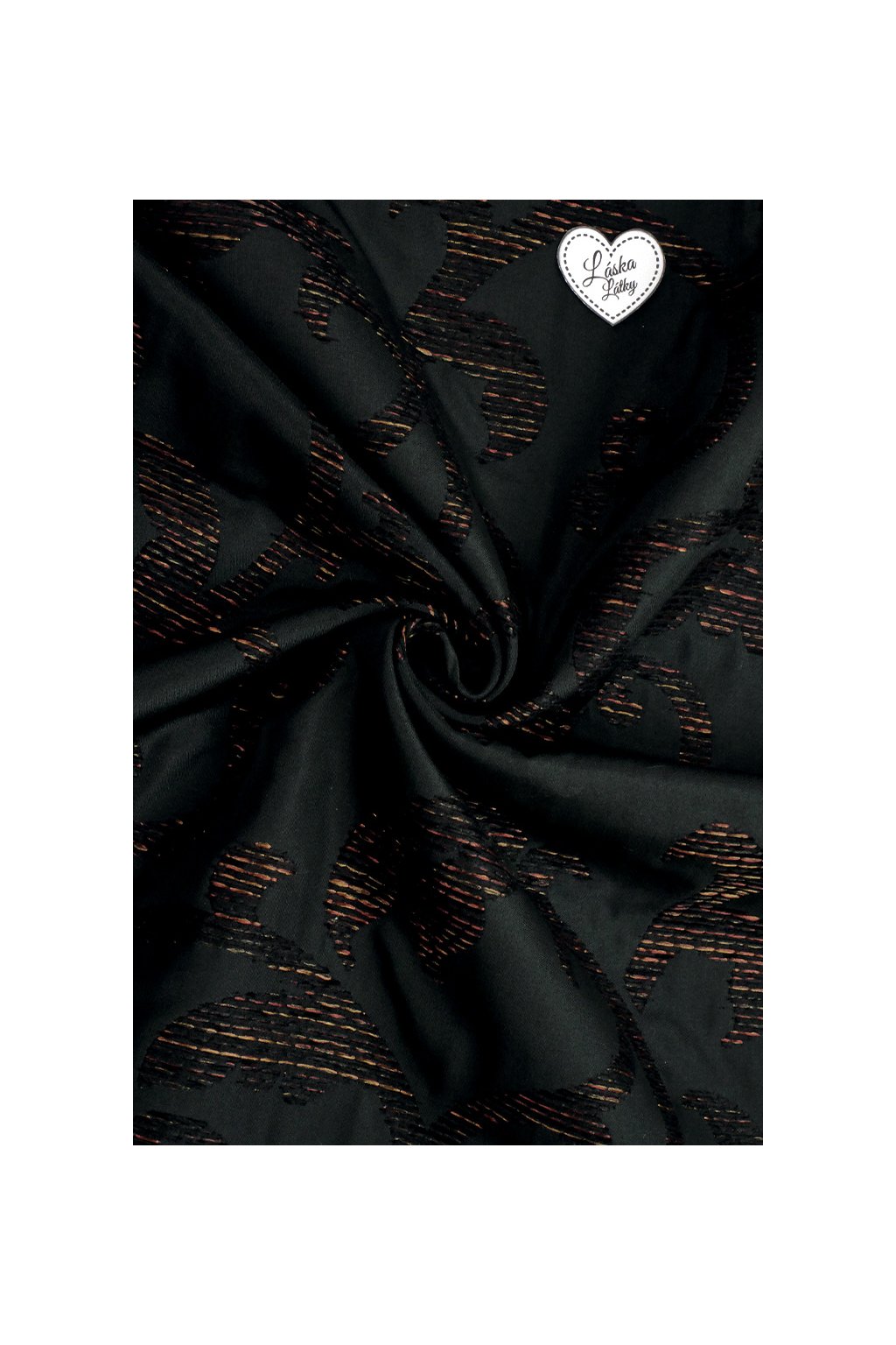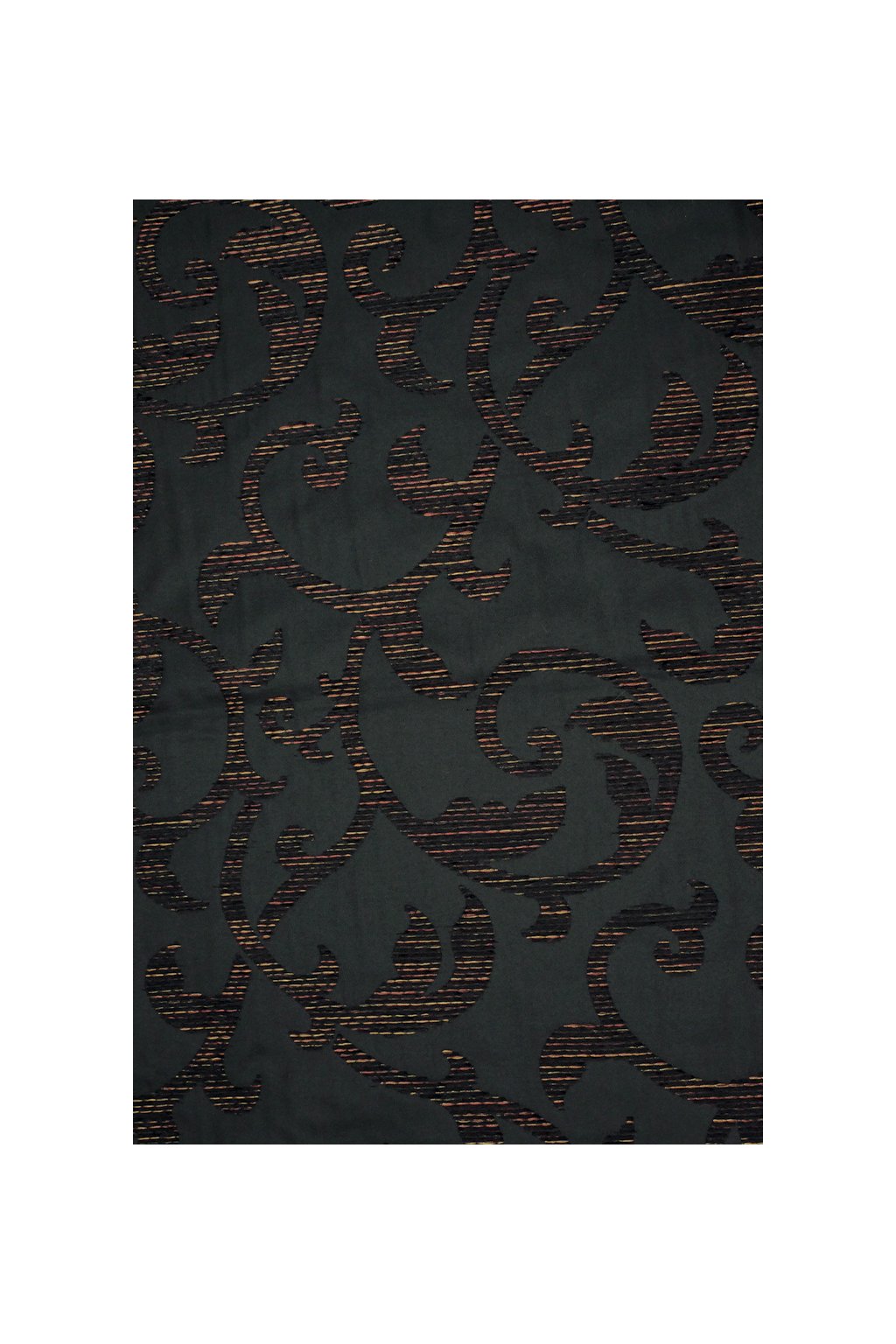 DEKORAČNÍ LÁTKA ŽINILKA S VETKANÝM VZOREM, ČERNÁ A MĚDĚNÁ