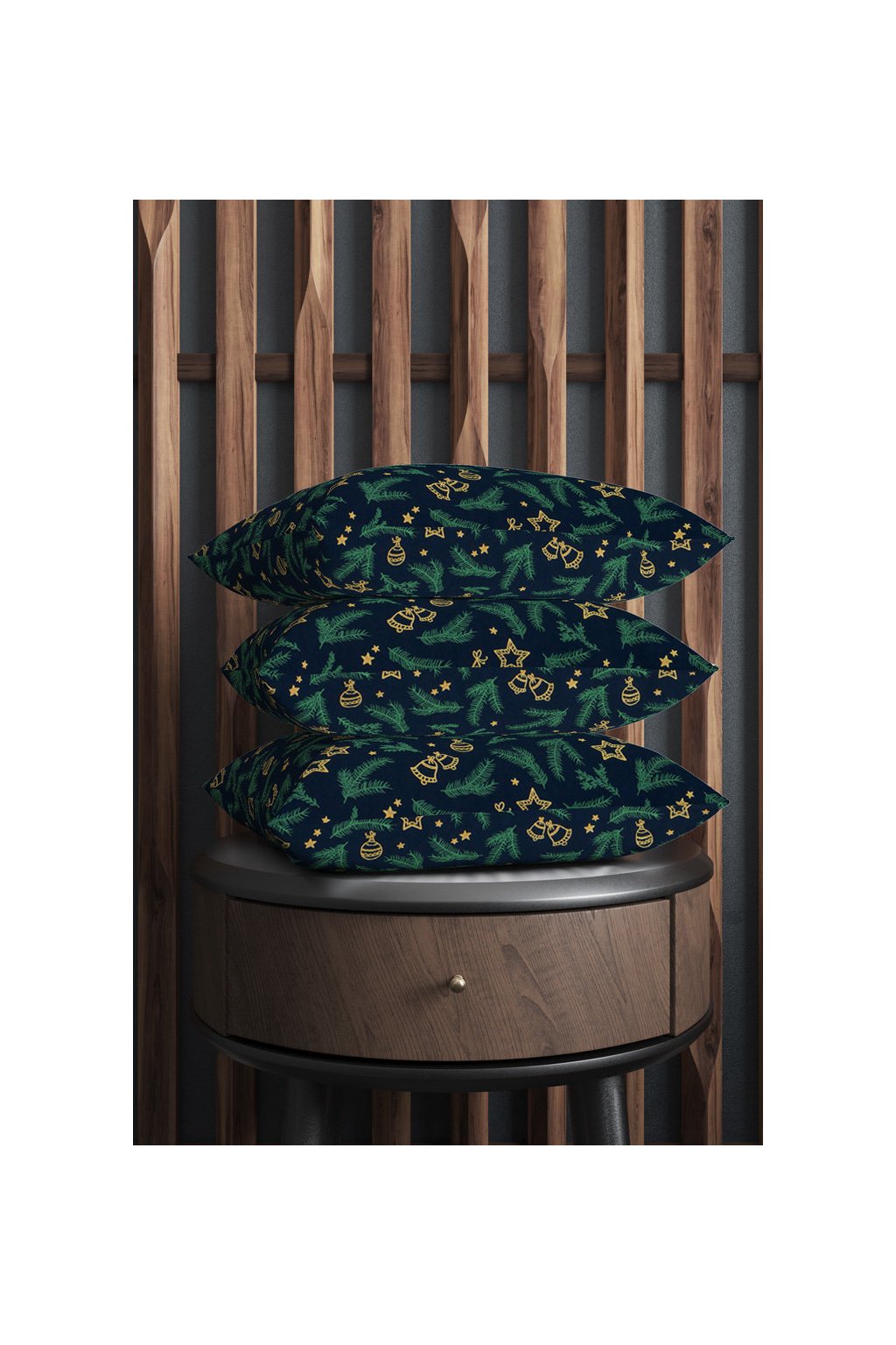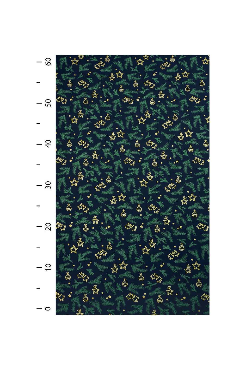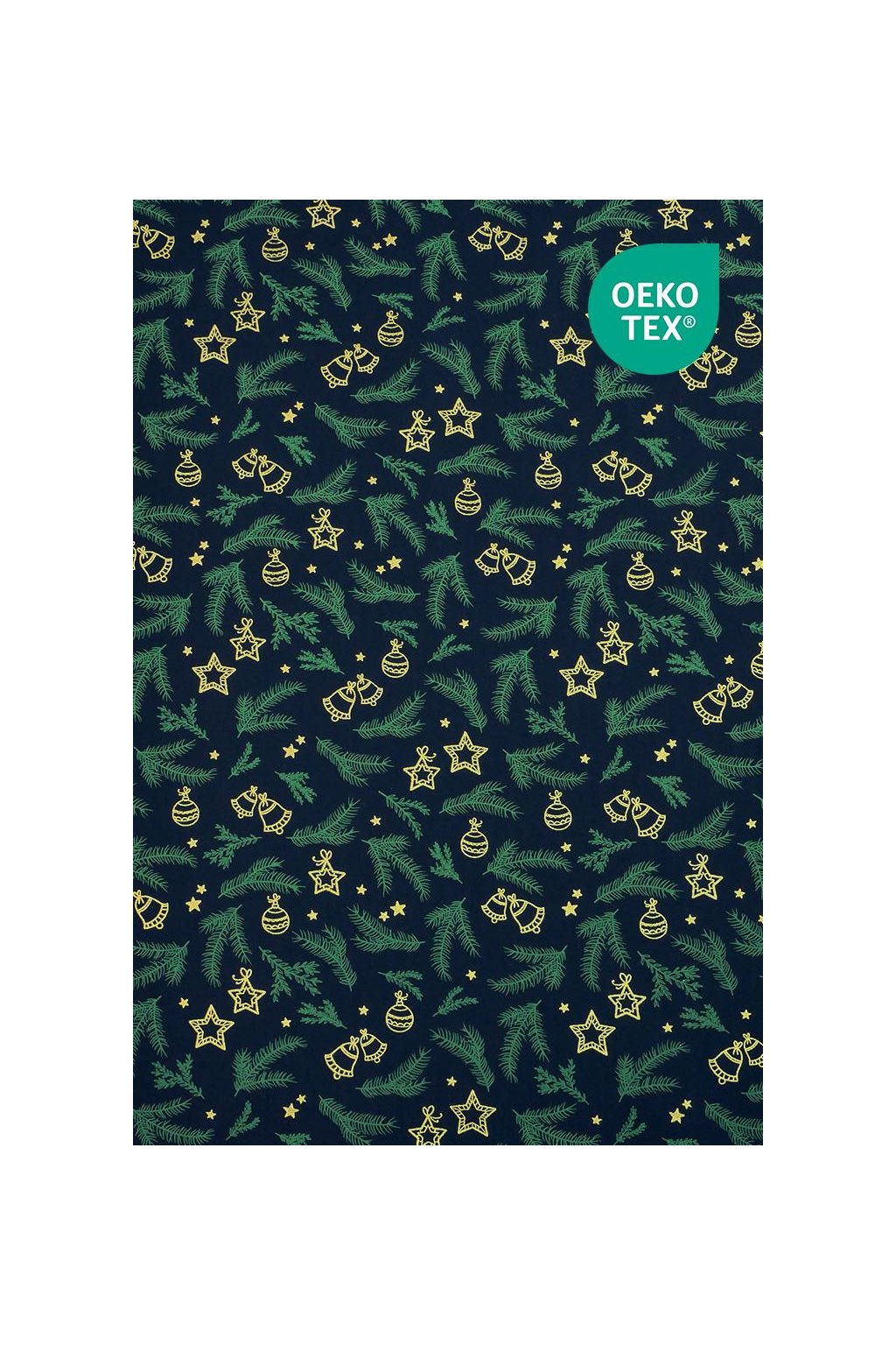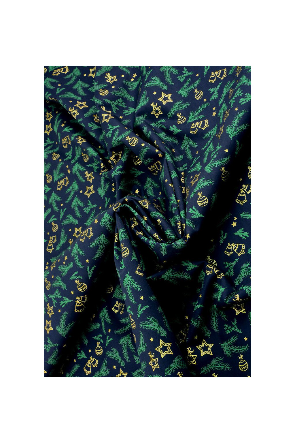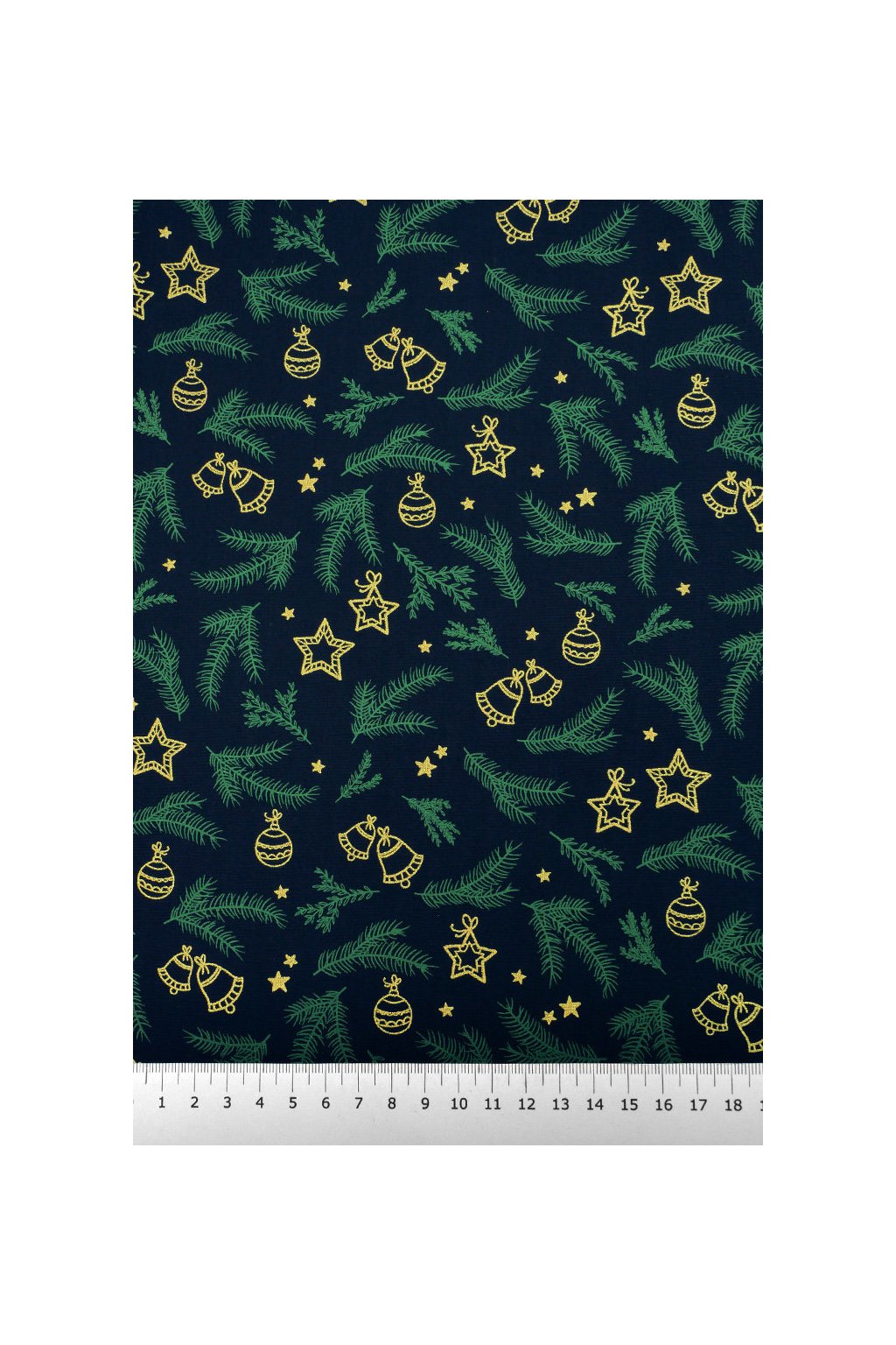 VÁNOČNÍ BAVLNA MODROČERNÁ, JEHLIČÍ A ZLATÉ OZDOBY