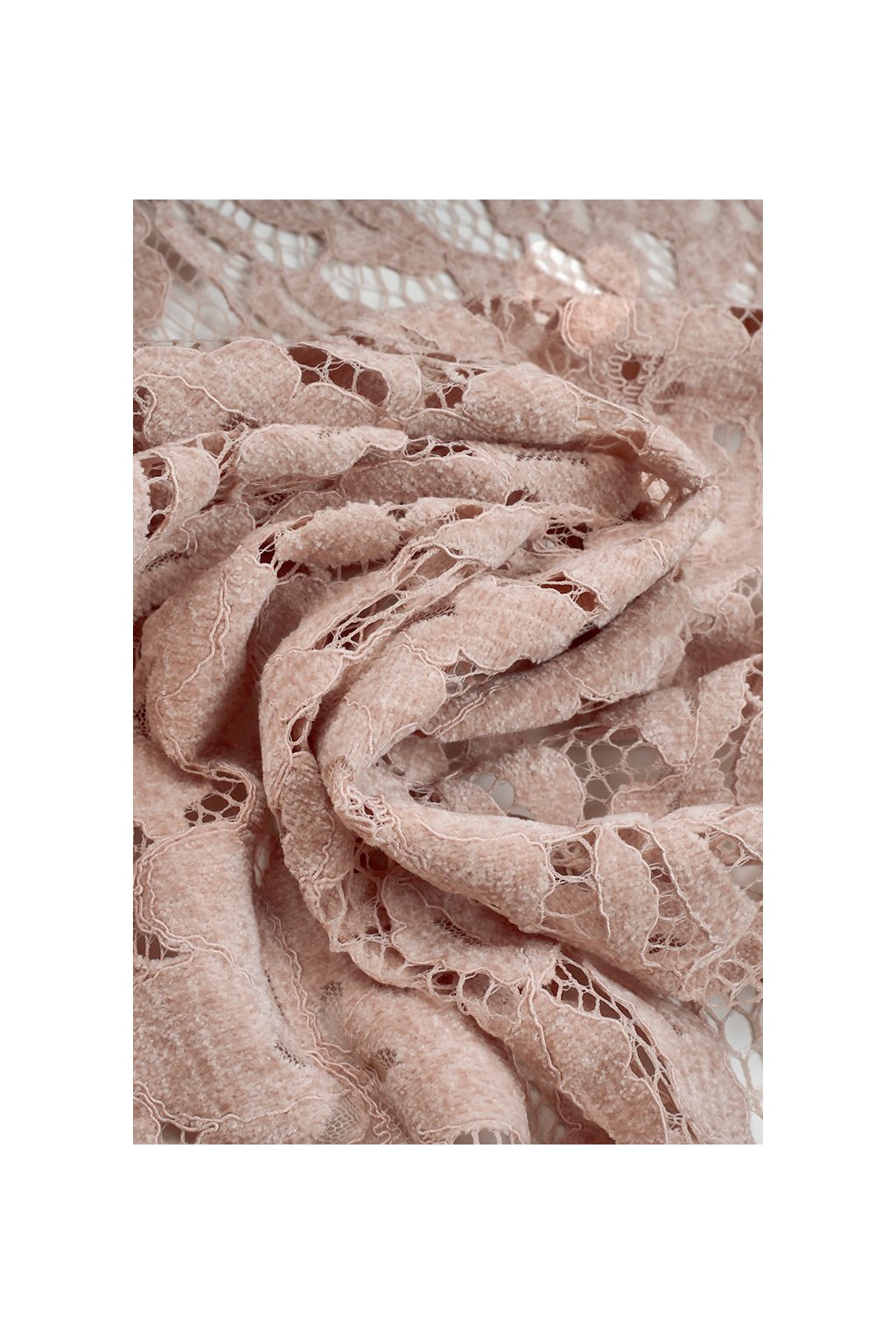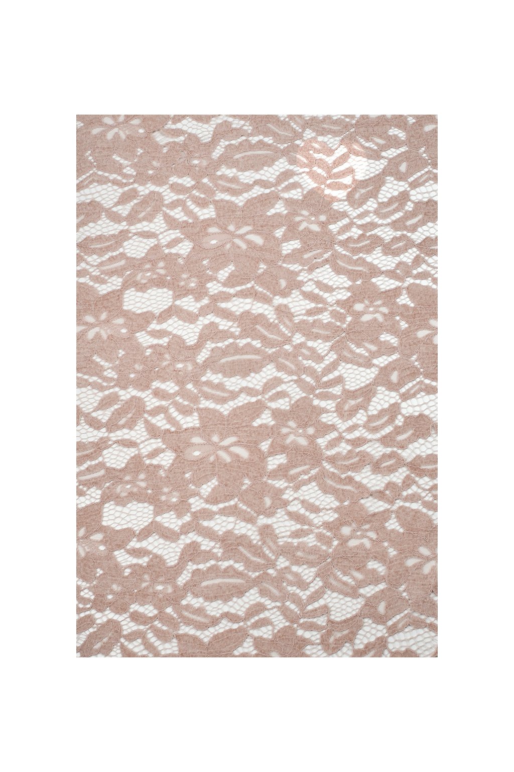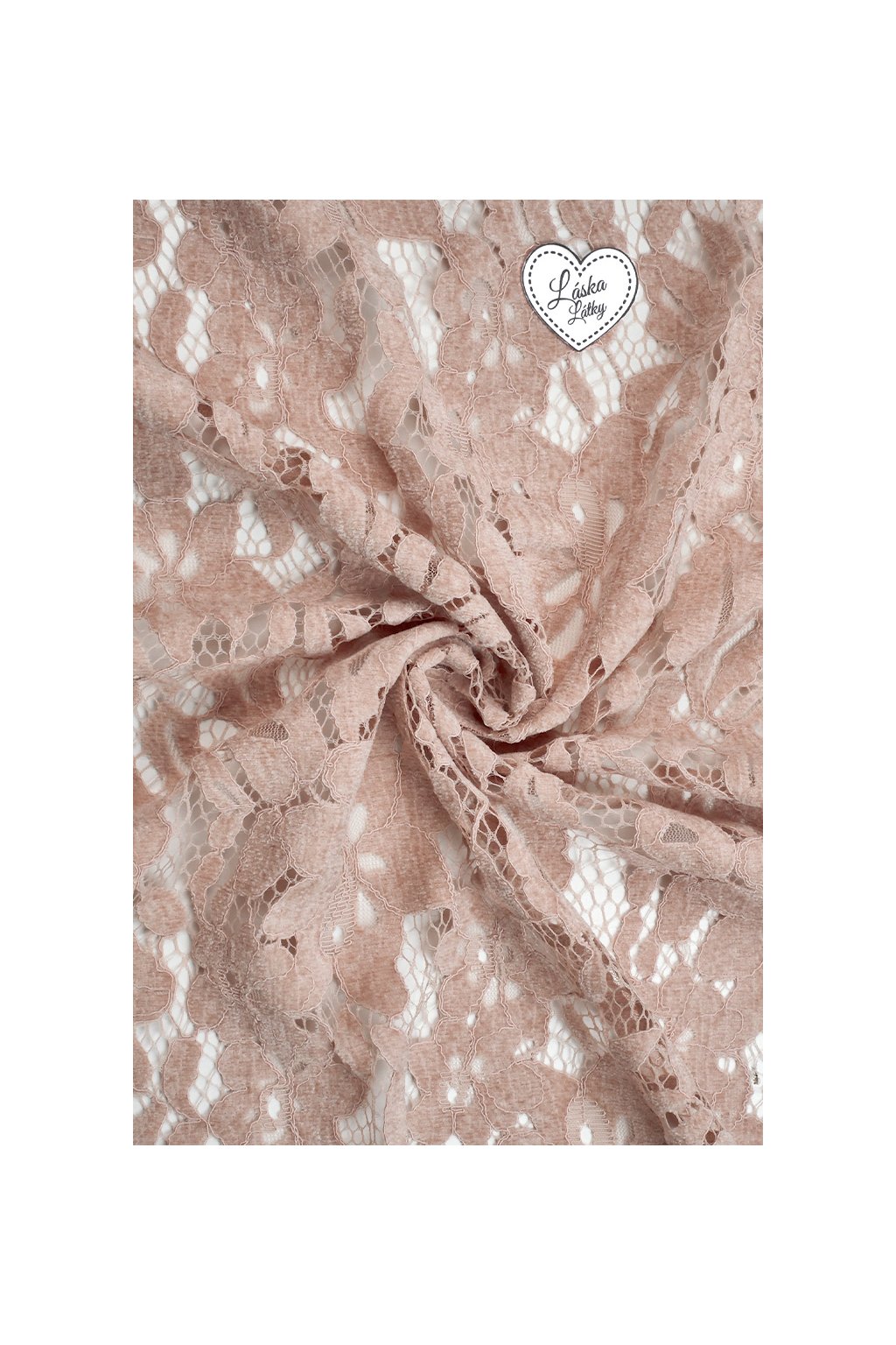 Elegantní pružná krajková látka v něžném pudrově tělového odstínu s jemným vzorem.