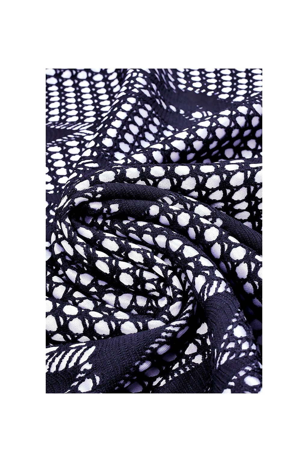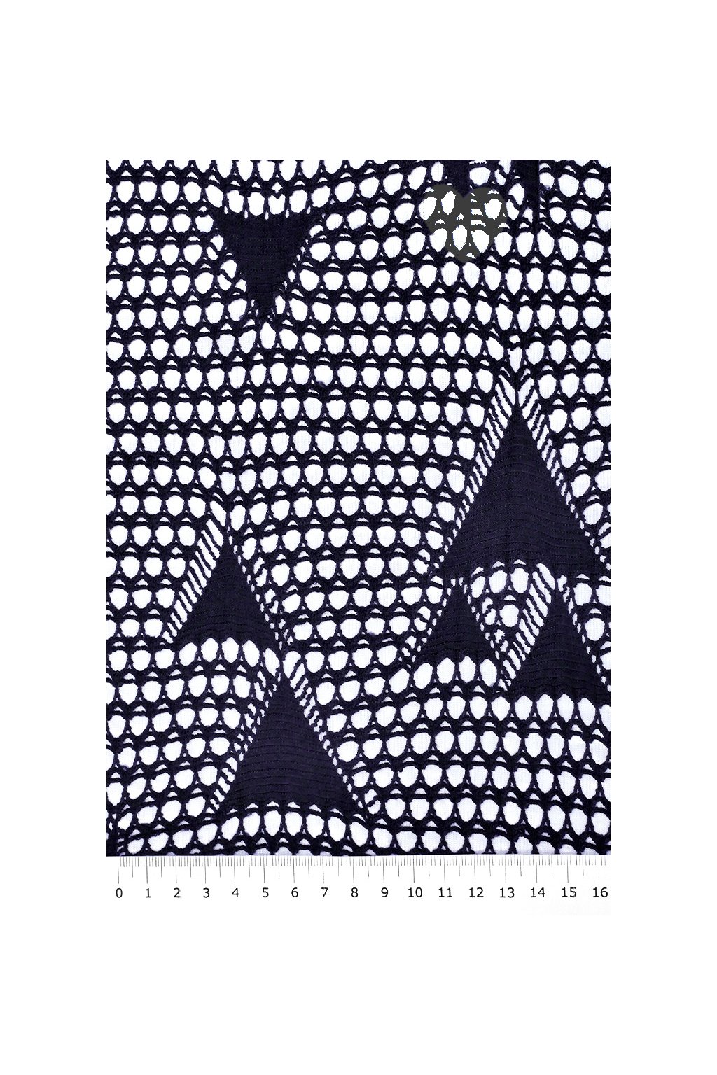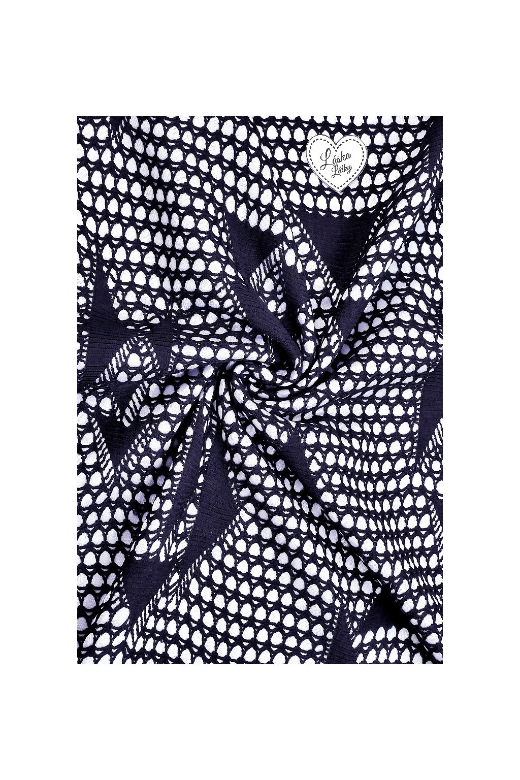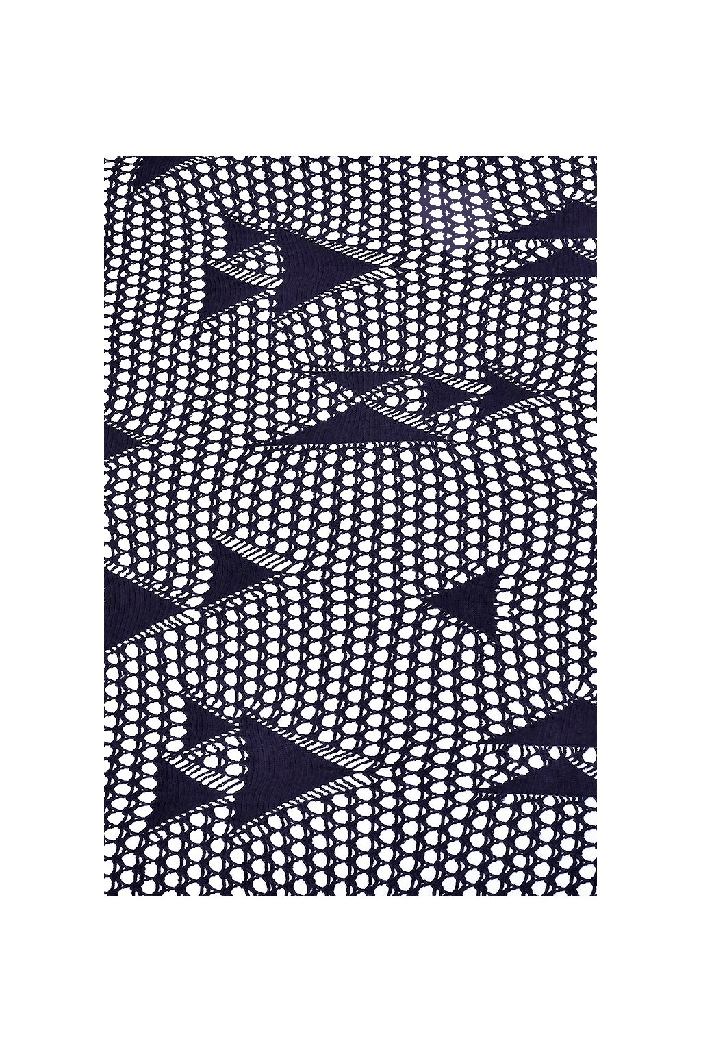 Elegantní a velmi efektní společenský úplet s hladkým, jemně lesklým spodním základem v lomené bílé barvě. Povrch tvoří druhá strukturovaná vrstva v tmavě modré, která působí jako háčkovaná síťovina či ozdobná krajka s moderním geometrickým motivem.