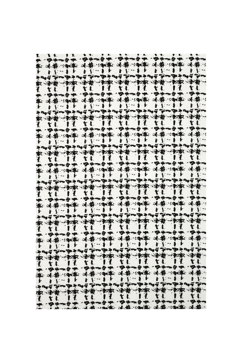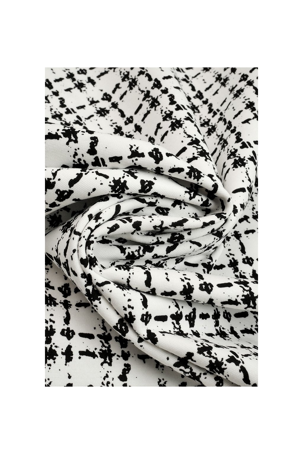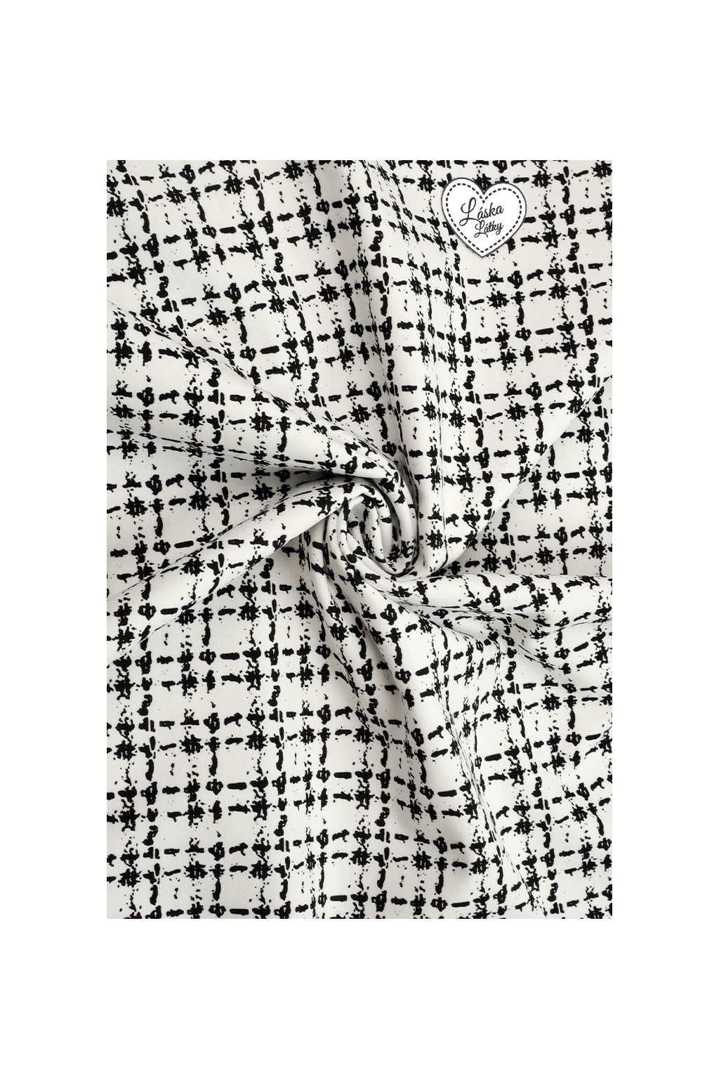 Konkrétně tento bavlněný úplet s příměsí polyamidu a elastanu zdobí nadčasový vzor v elegantní kombinaci lomené bílé a černé.