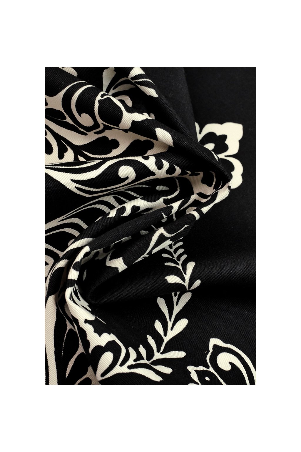 Bavlněné plátno s příměsí elastanu a vzorem s ornamenty je pevnější, ale zároveň příjemný materiál s lehkou pružností pro vyšší komfort při nošení.