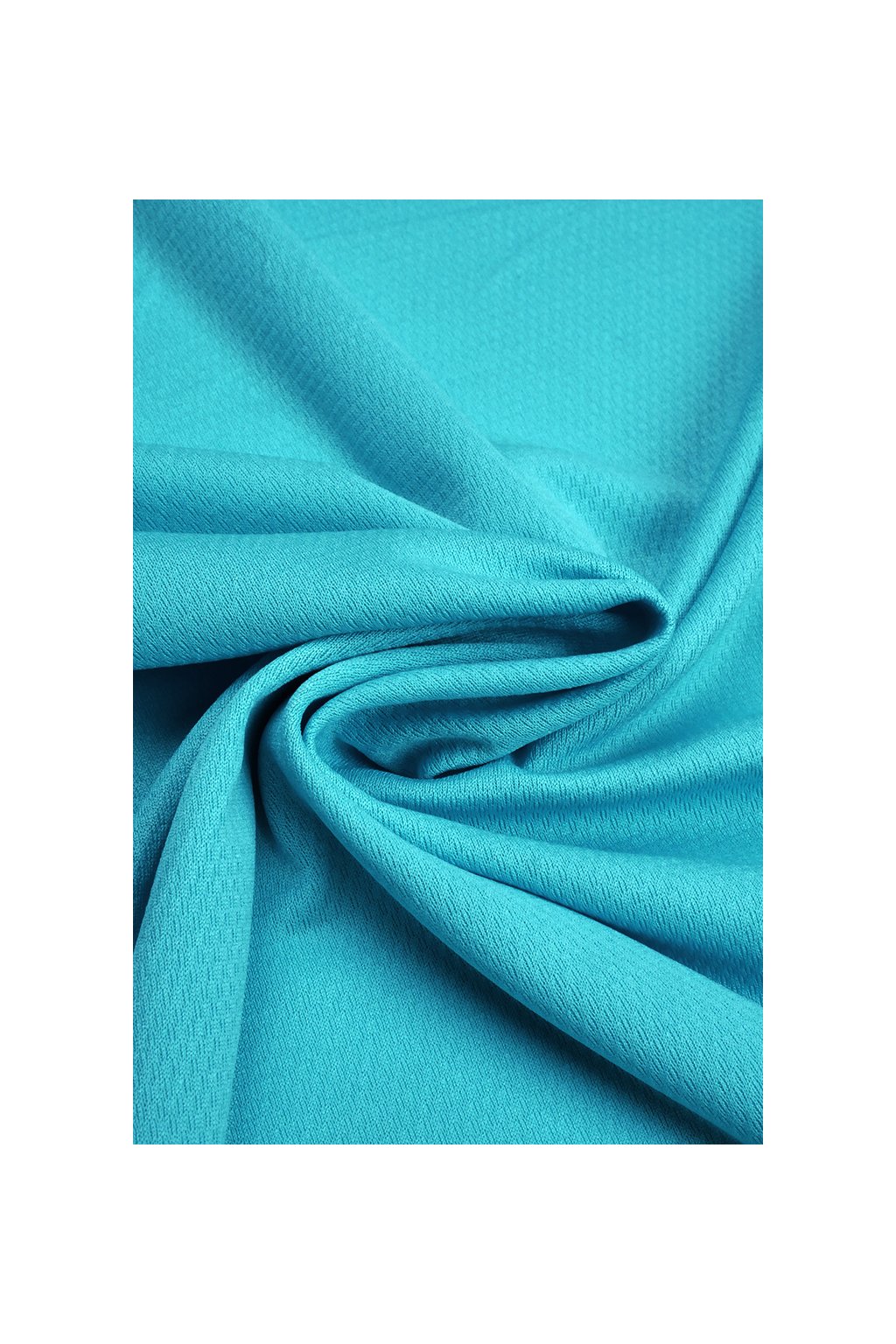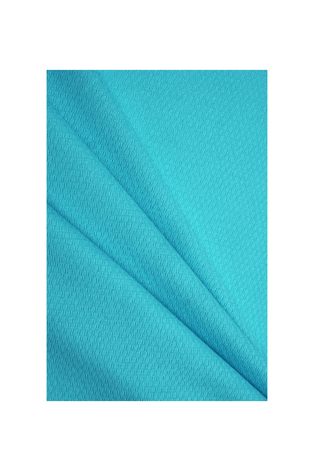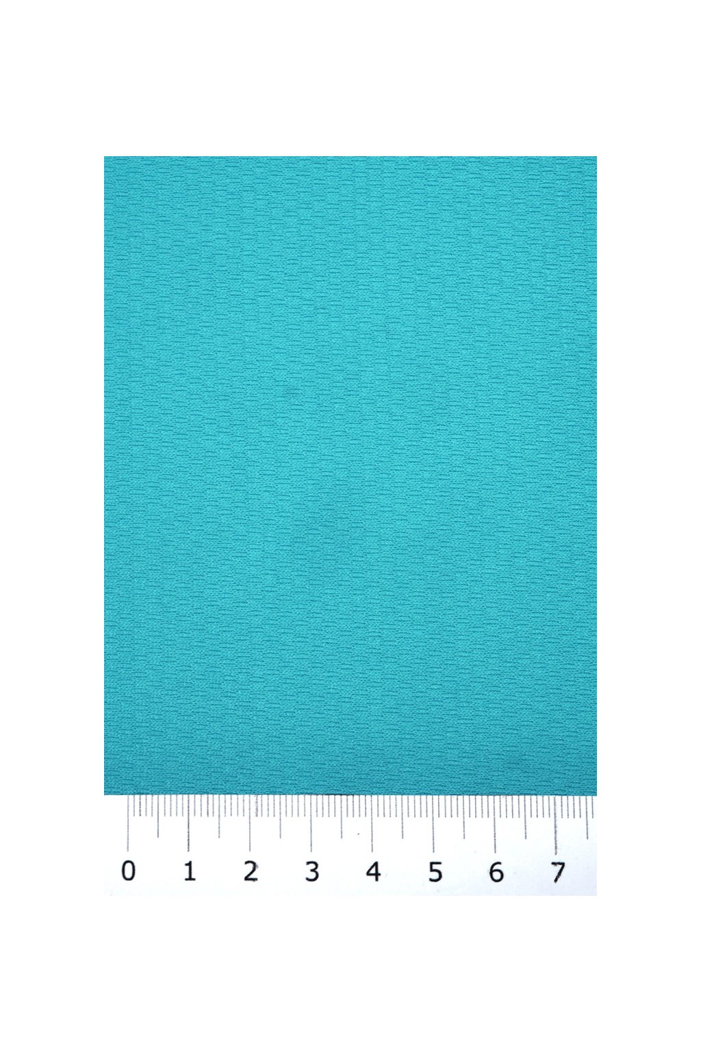 Sportovní lehký úplet v světlé tyrkysové barvě s perforací a plastickým vzorem na rubové stráné, lehce prosvítá.