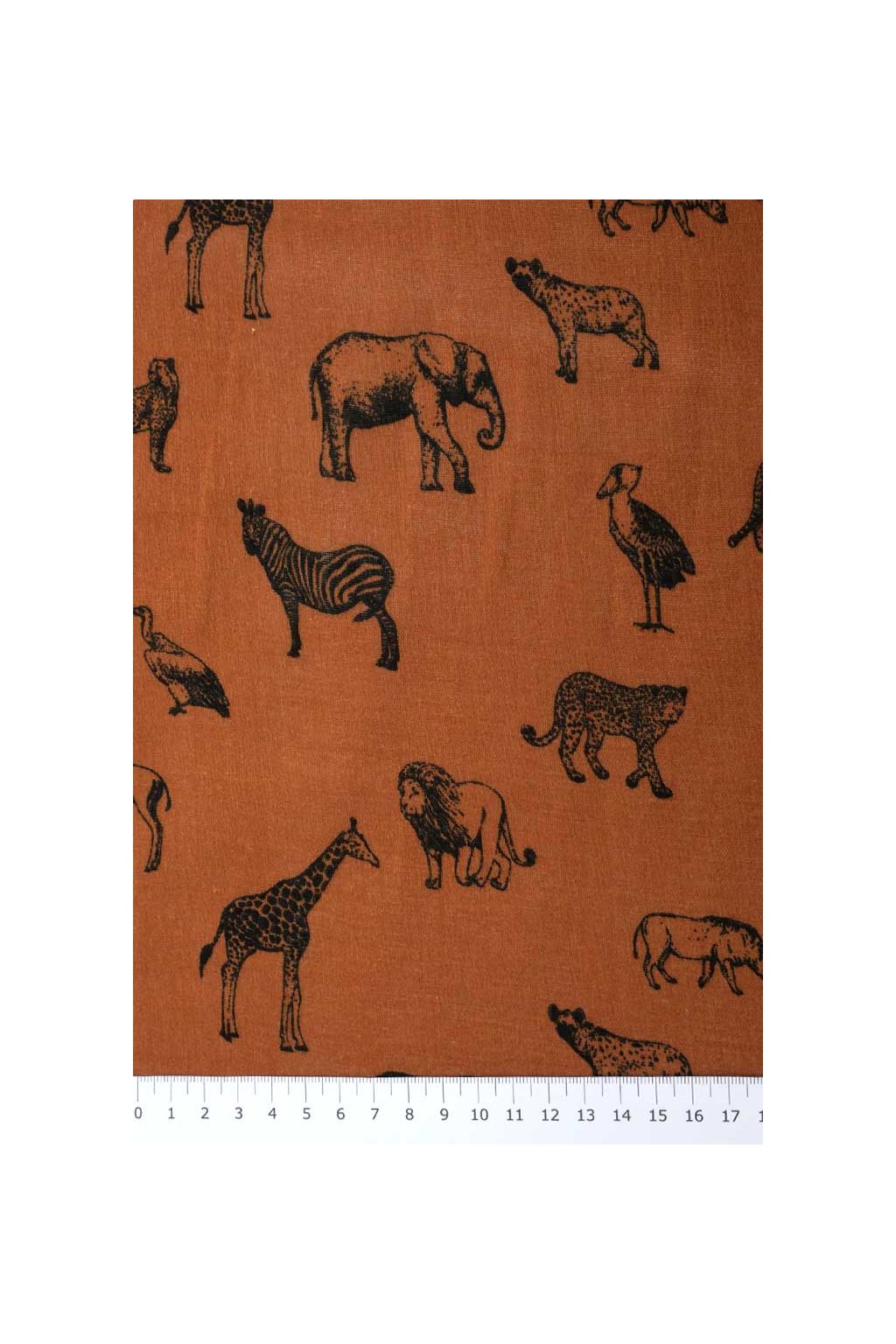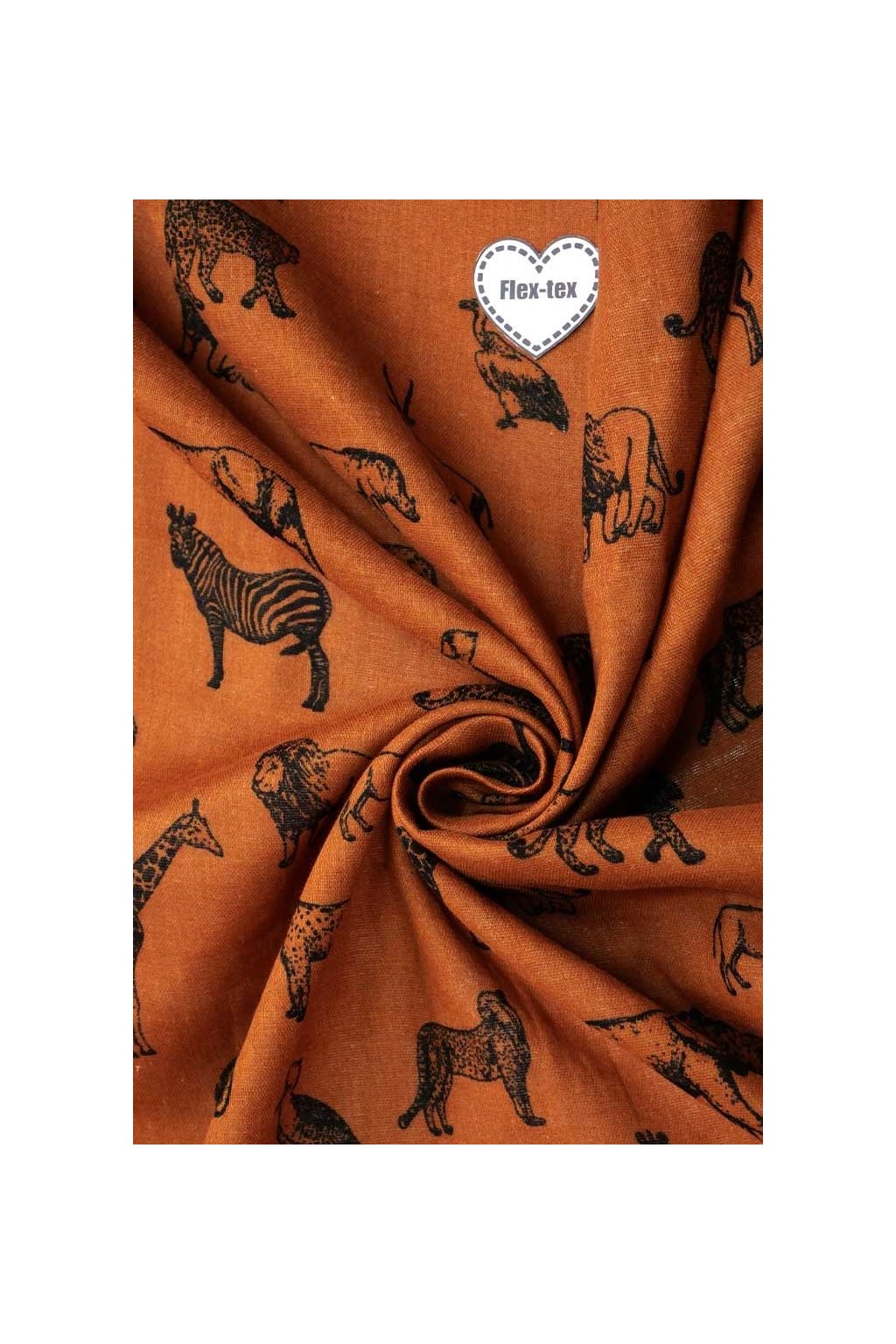 Dvojitá gázovina s motivem afrických zvířat na podkladu karamelové barvy.