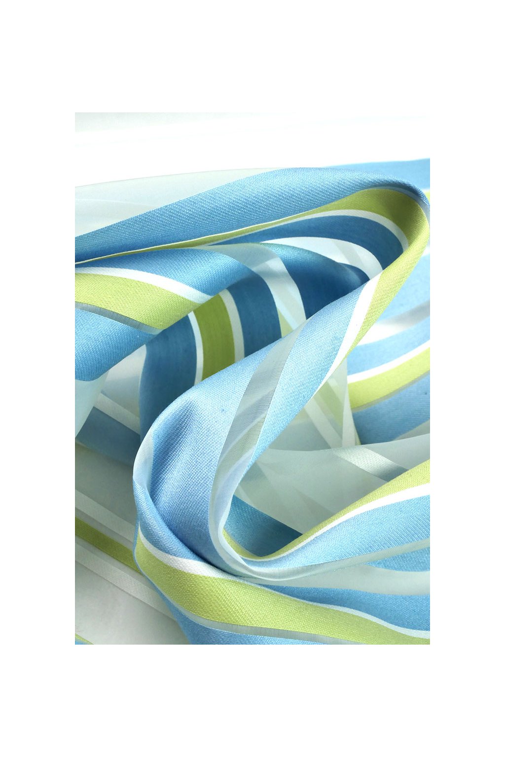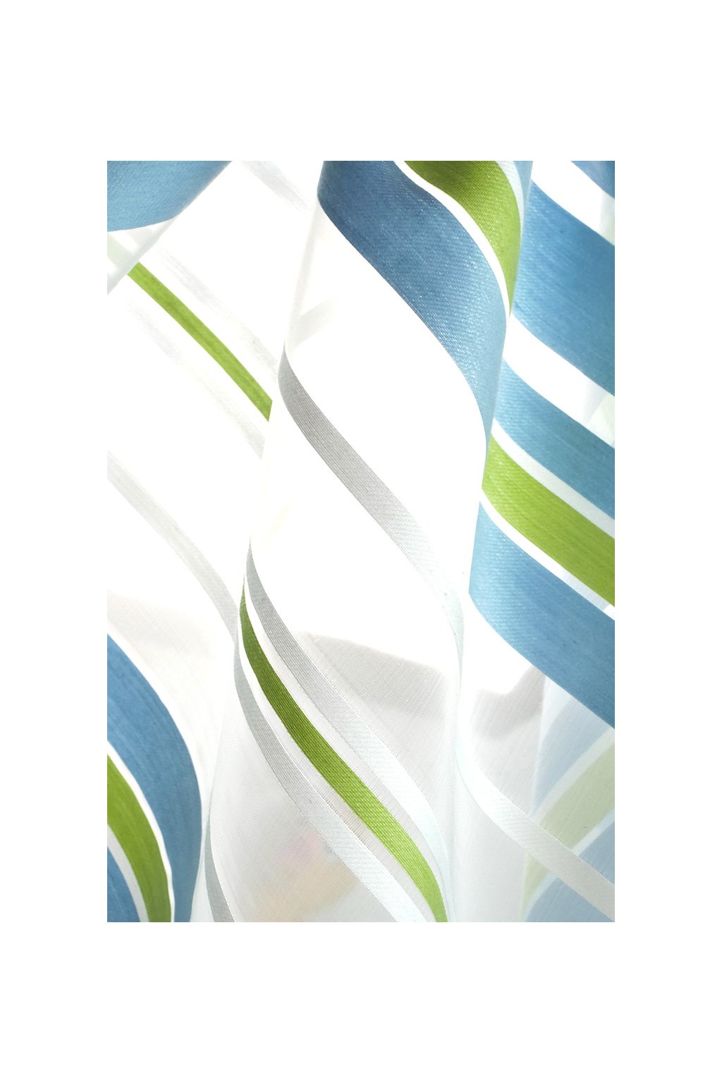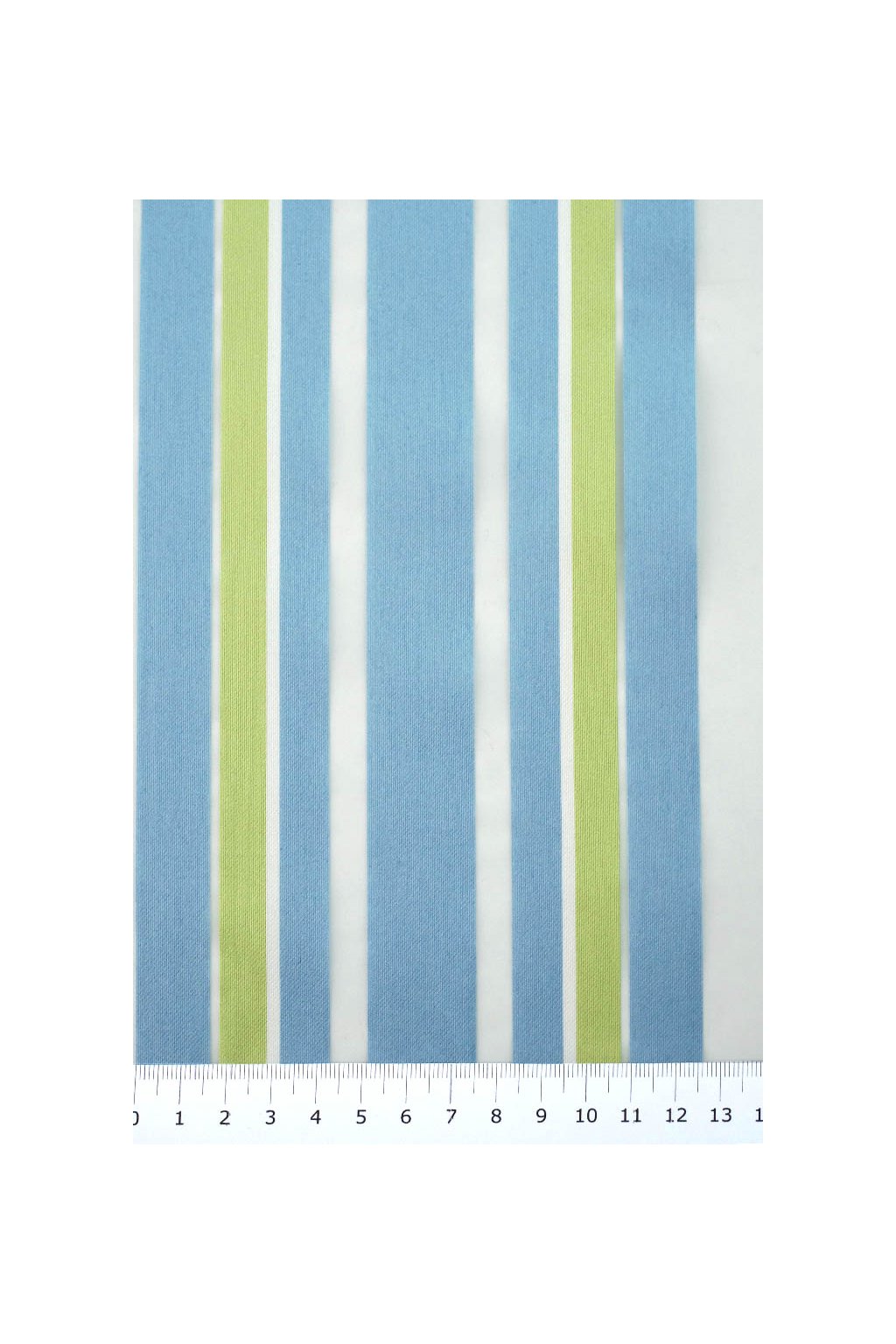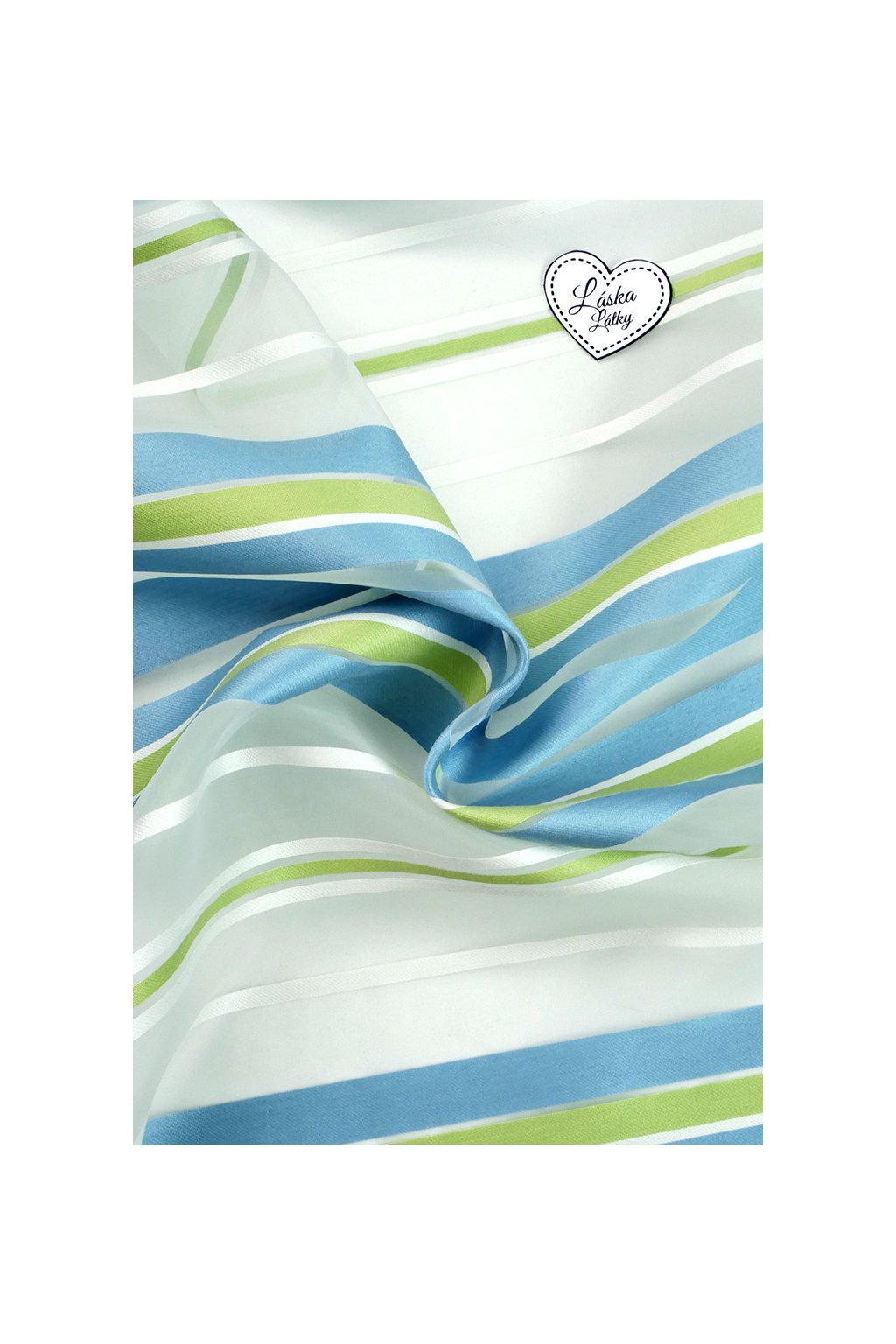 Lehká a jemná košilovina z bavlny s příměsí polyamidu, která materiálu dodává odolnost a pomáhá mu lépe držet tvar. Látka má průhledný základ a výrazný vzor pruhů v světlé modré a zelené barvě.