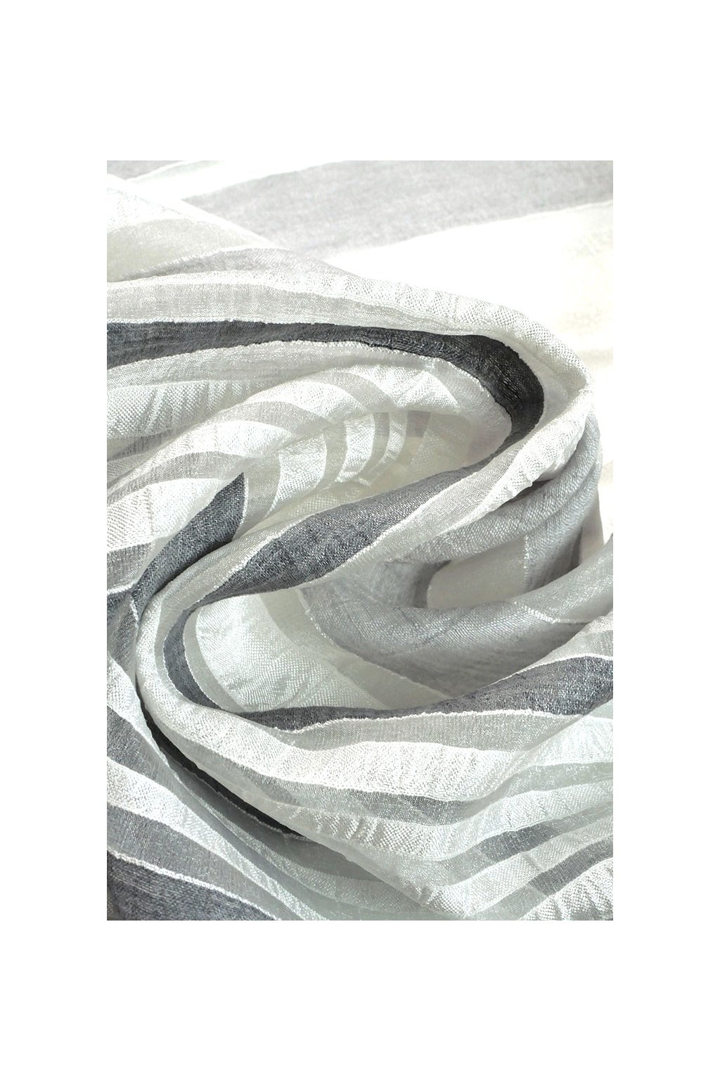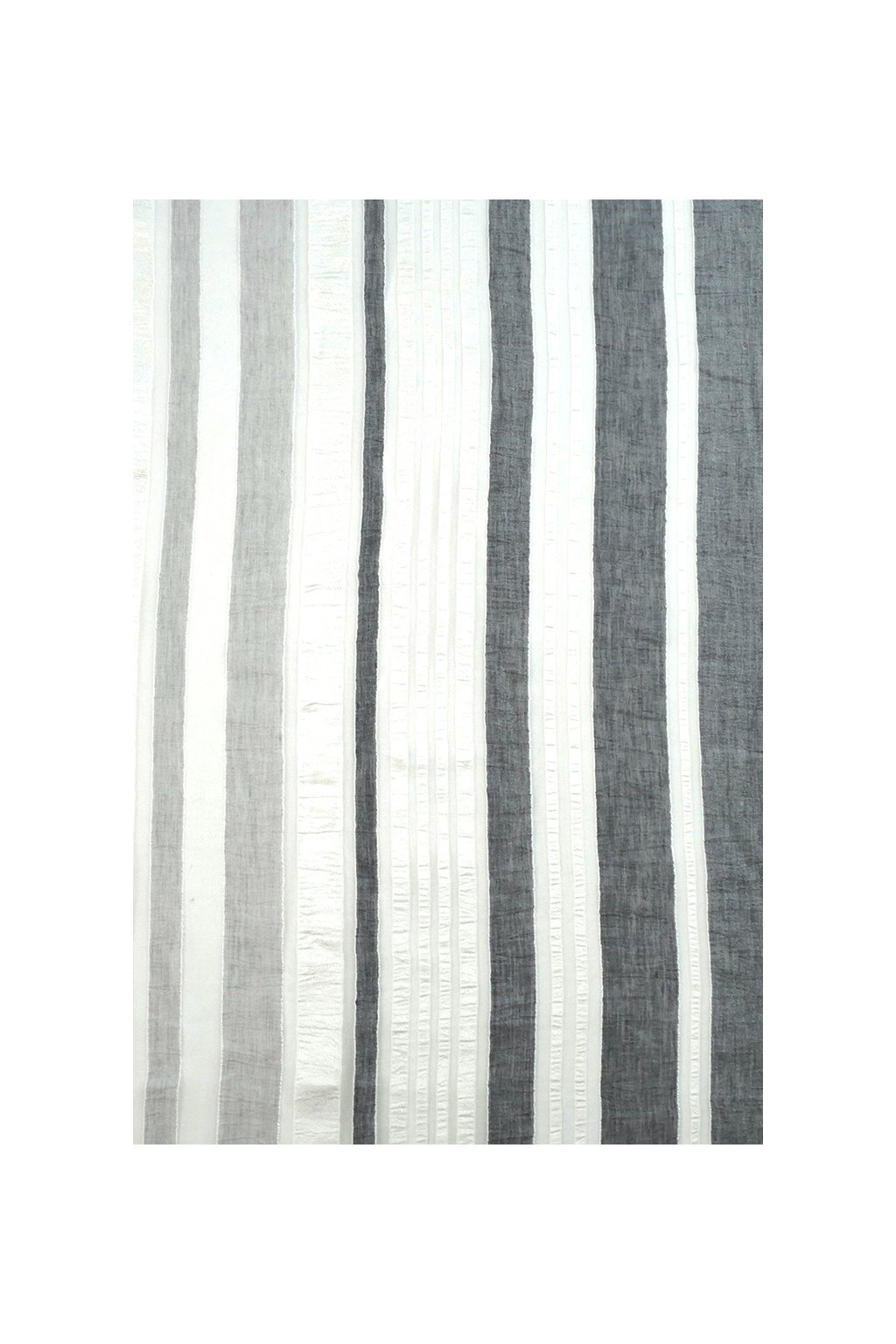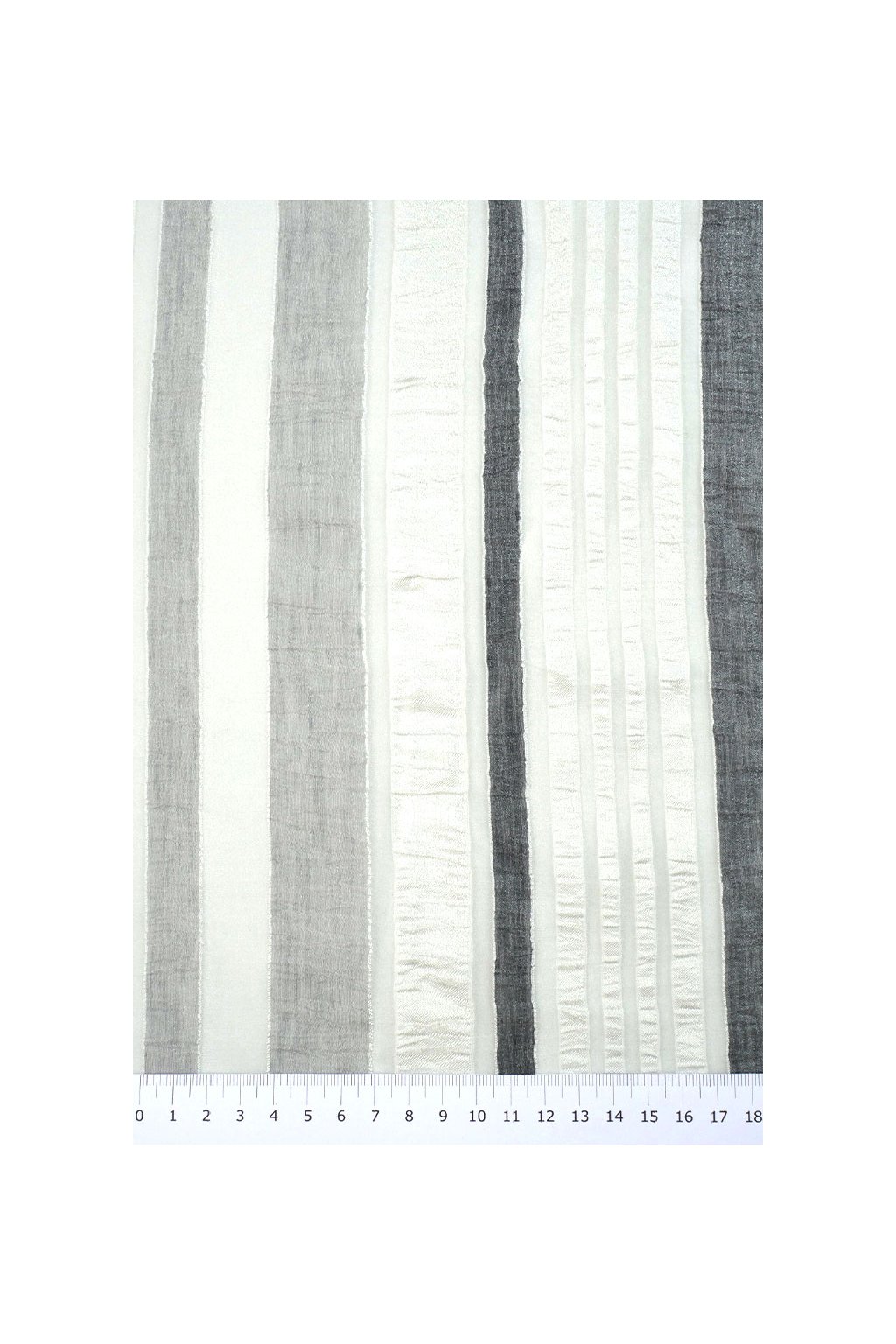 Lehká a jemná košilovina z viskózy s příměsí polyamidu, která materiálu dodává odolnost a pomáhá mu lépe držet tvar. Látka má průhledný základ a výrazný vzor pruhů v šedých odstínech. Lesklý efekt dodává látce noblesu a působivý vizuální dojem při každém pohybu.