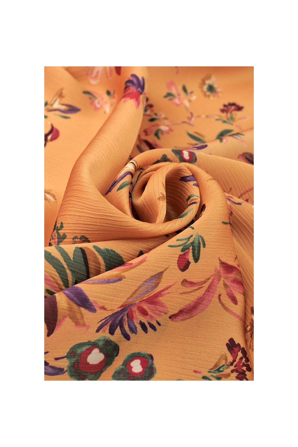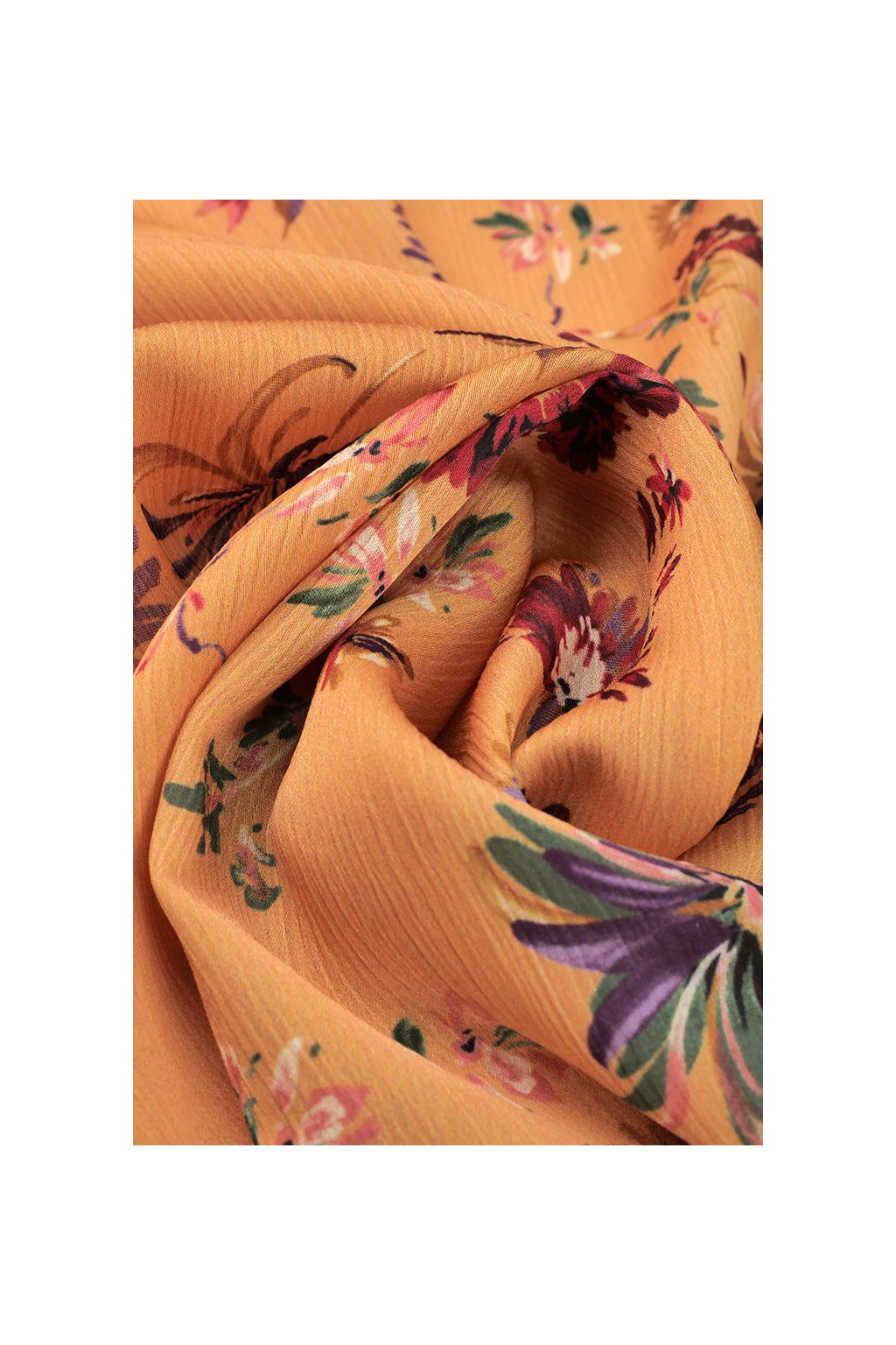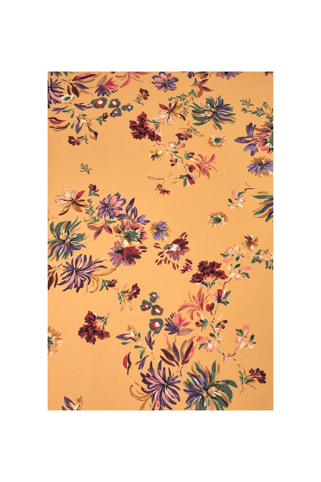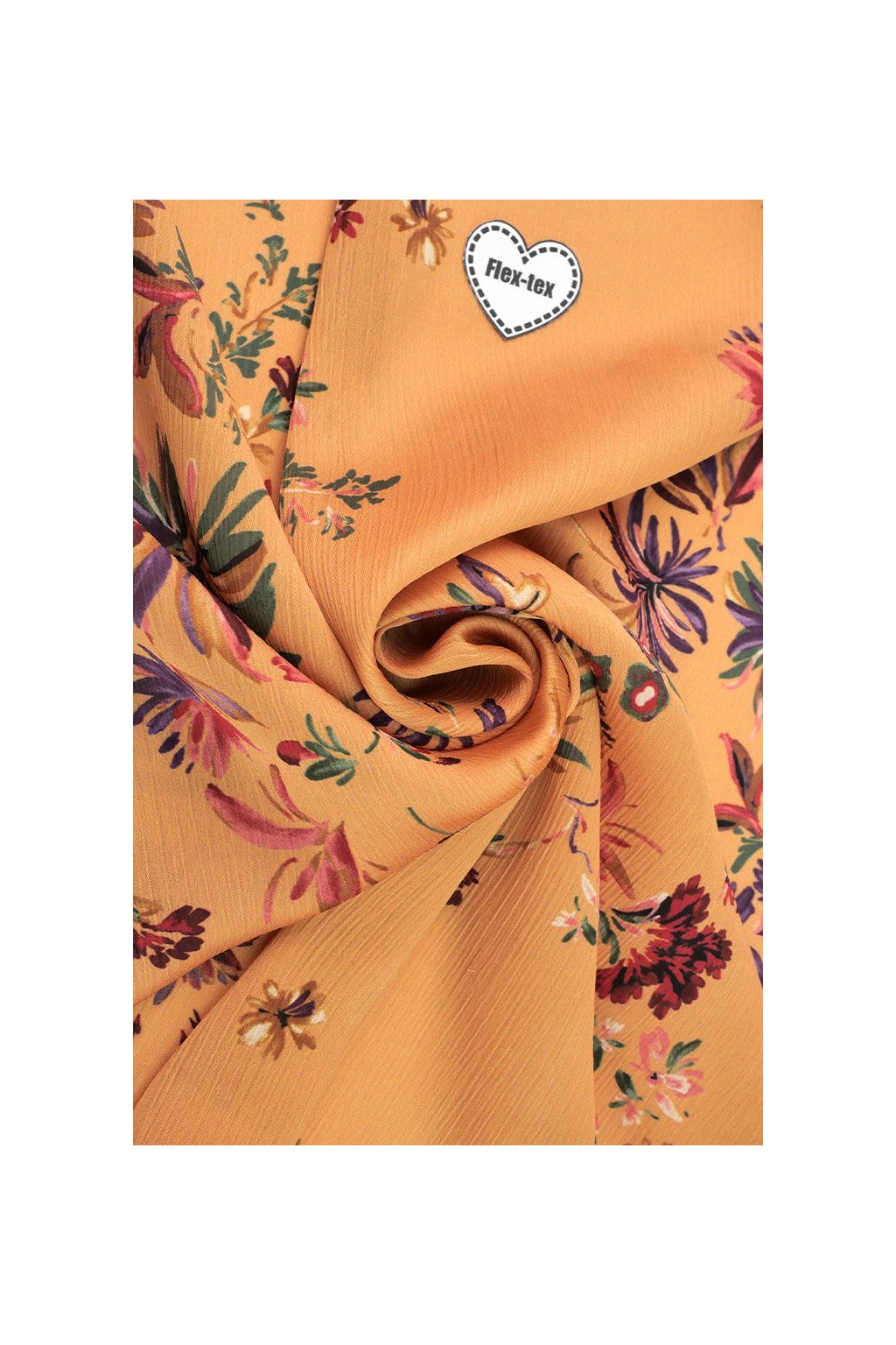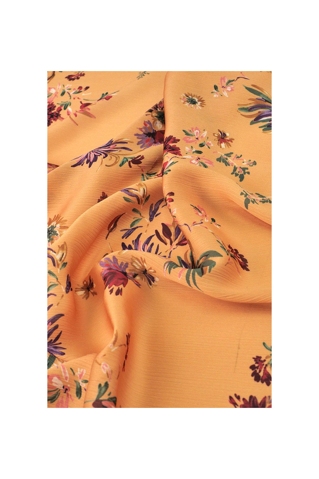 Šifonová látka žluto-oranžové barvy s květinovým vzorem.Doplňkové parametry