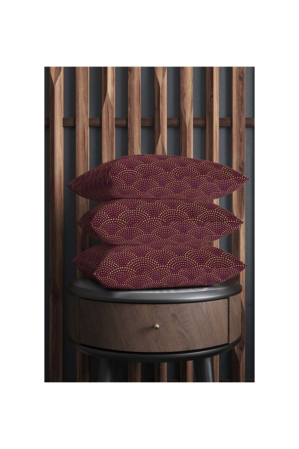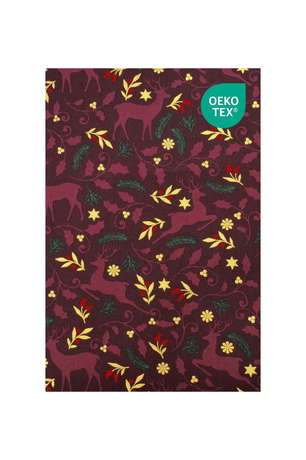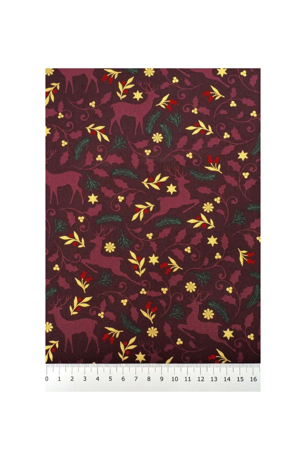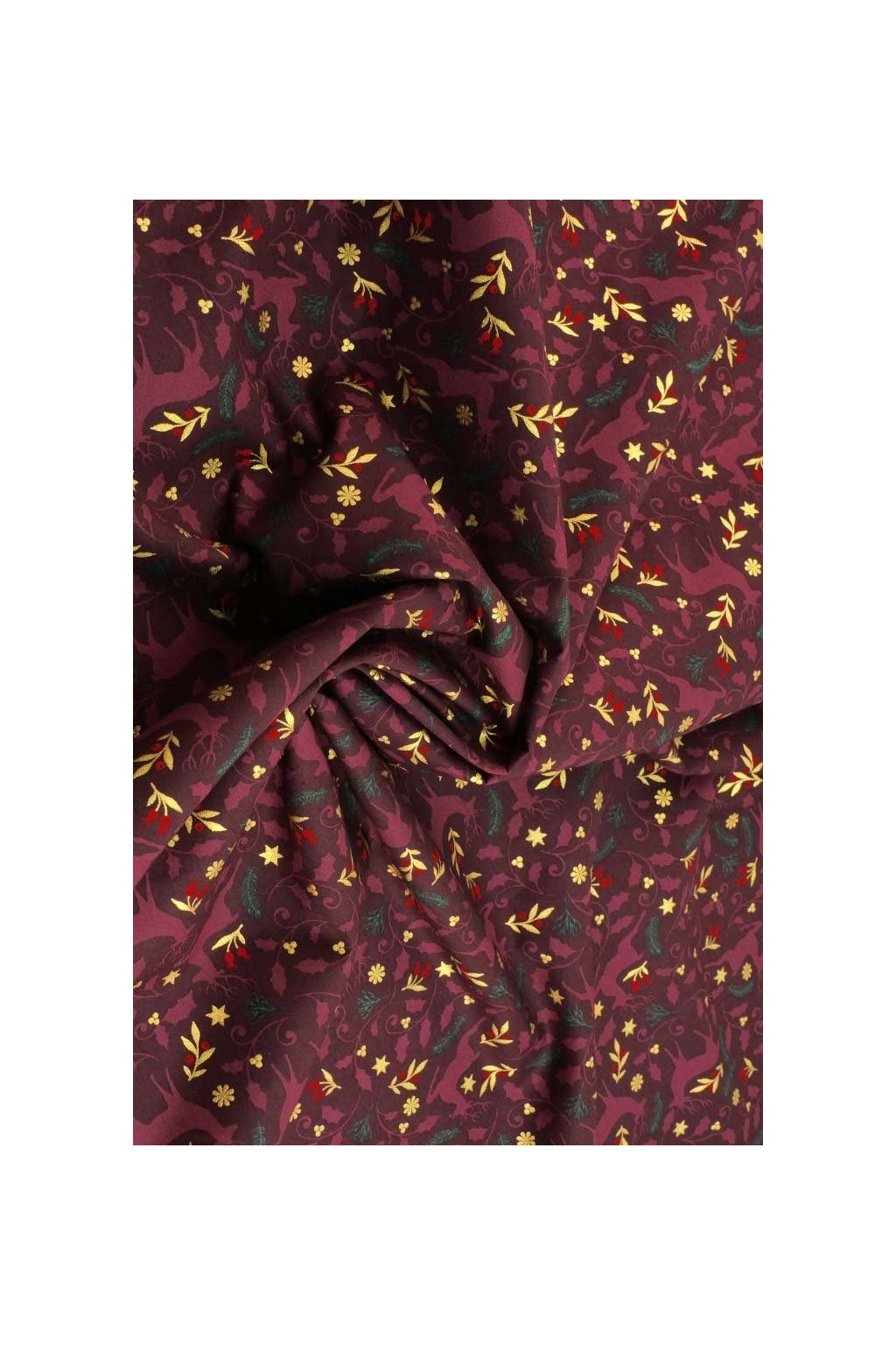 Příjemná vánoční bavlna bordó barvy se vzorem drobných zlatých větviček a jelena.