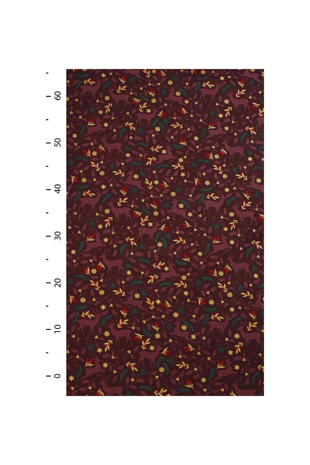 VÁNOČNÍ BAVLNA BORDÓ SE ZLATOU, ROSTLINNÝ MOTIV A JELEN