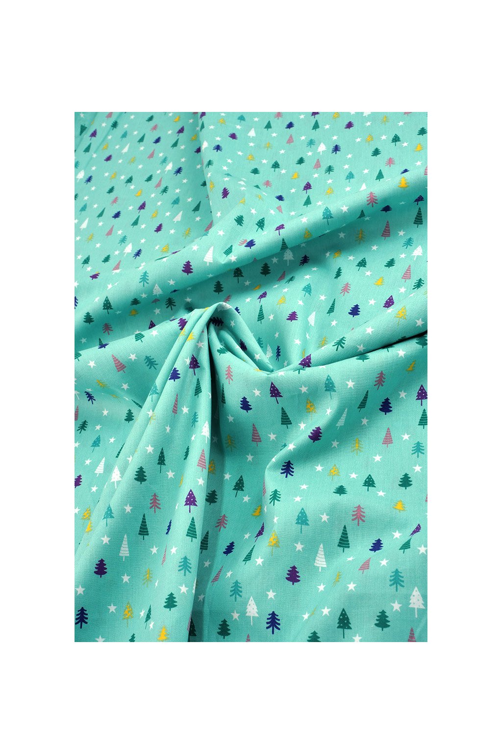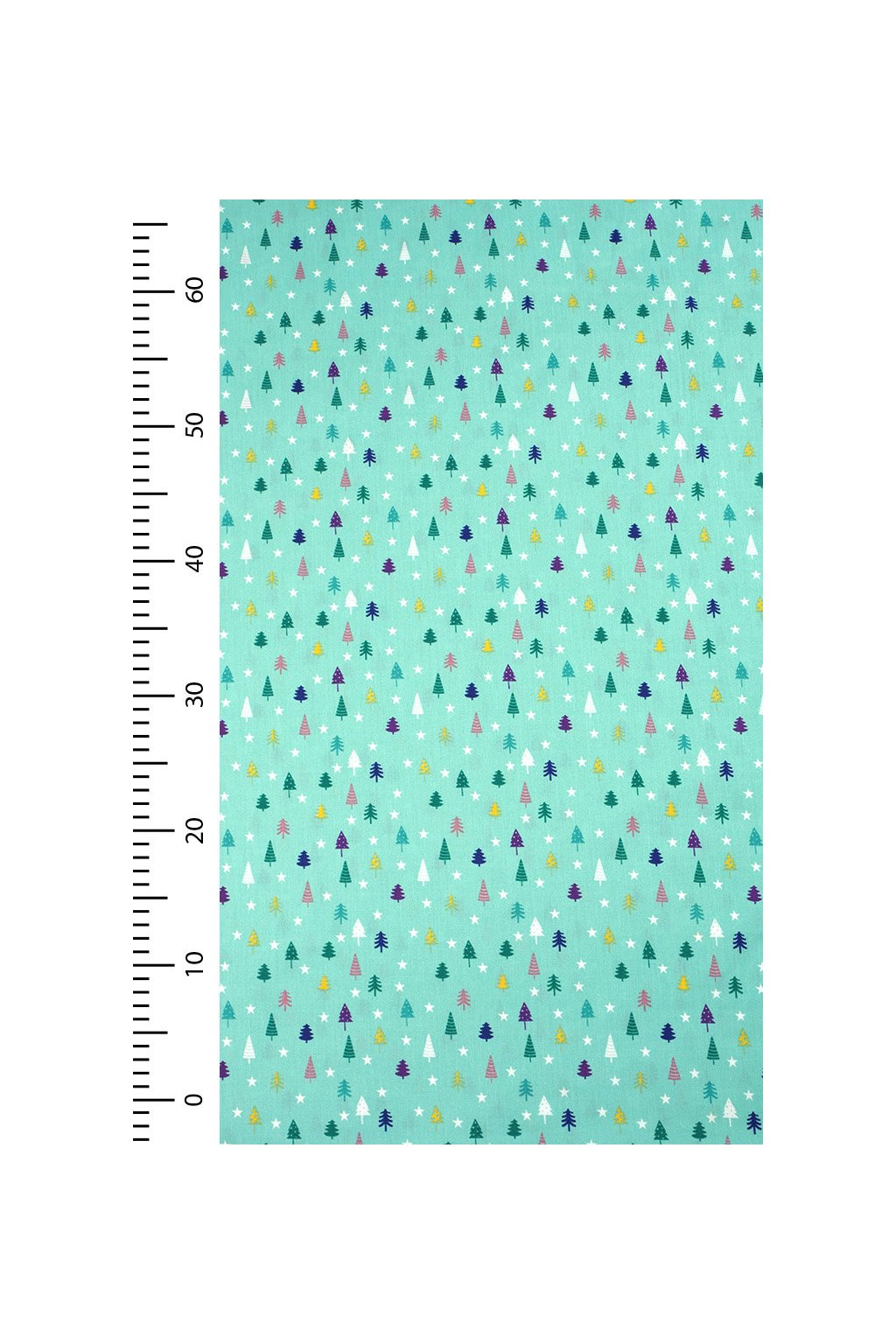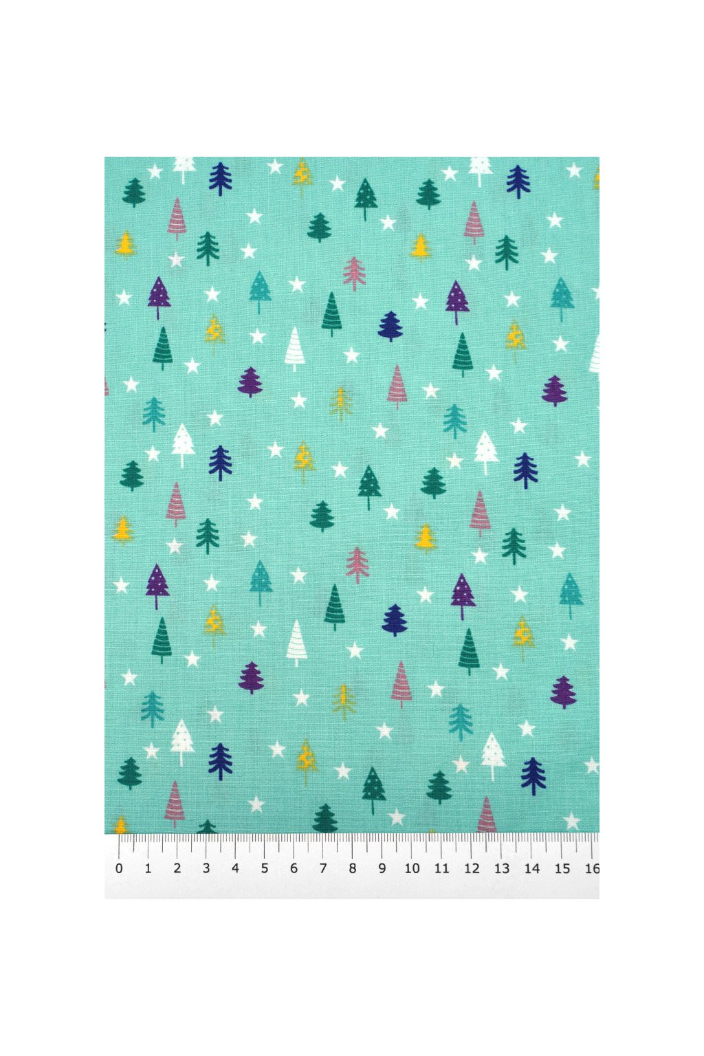 Příjemná vánoční bavlna mentolové barvy s barevnými stromečky.