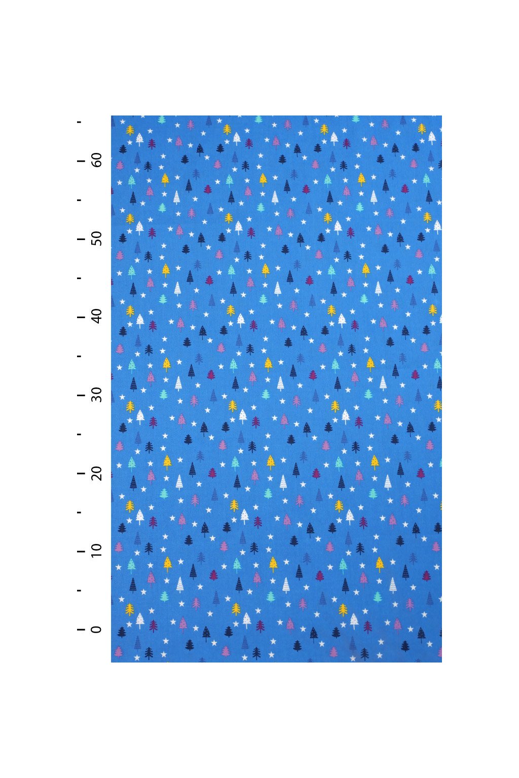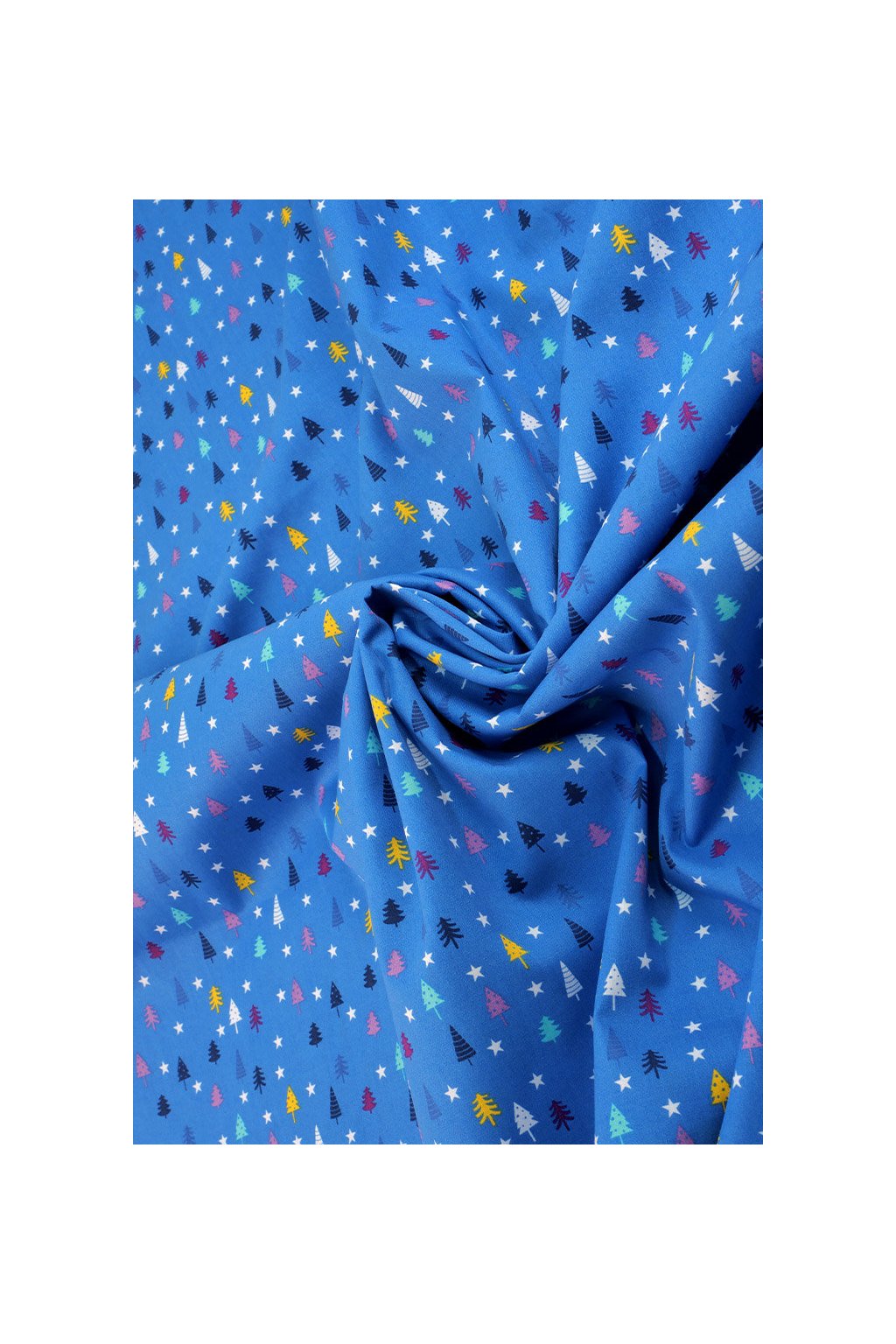 Příjemná vánoční bavlna modré barvy s barevnými stromečky.