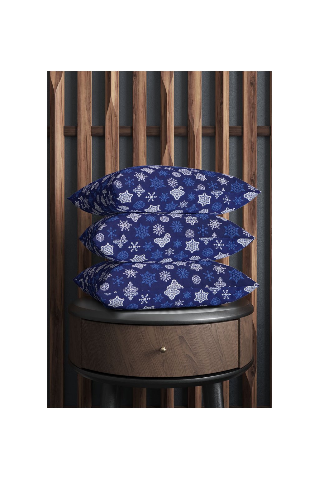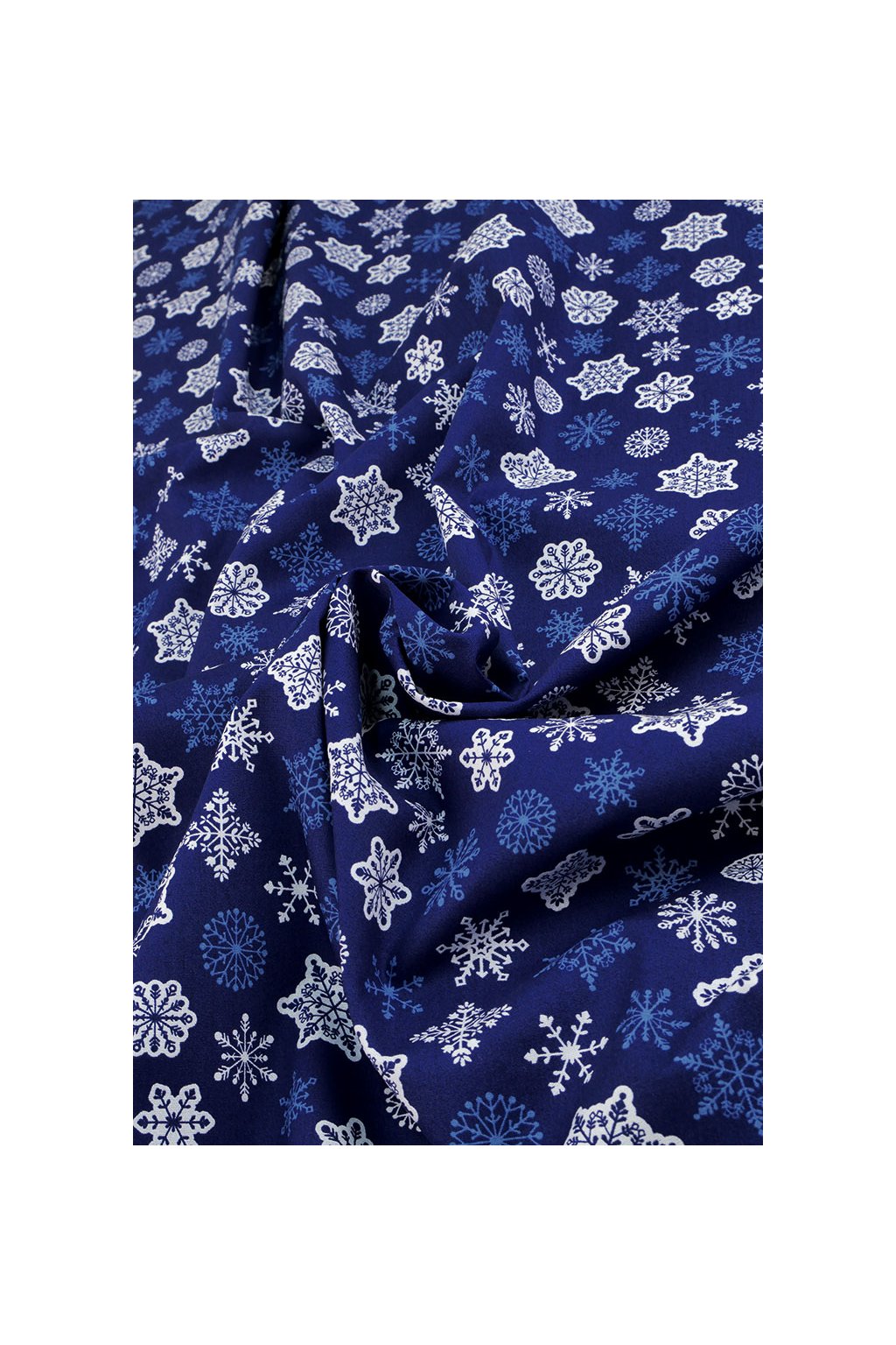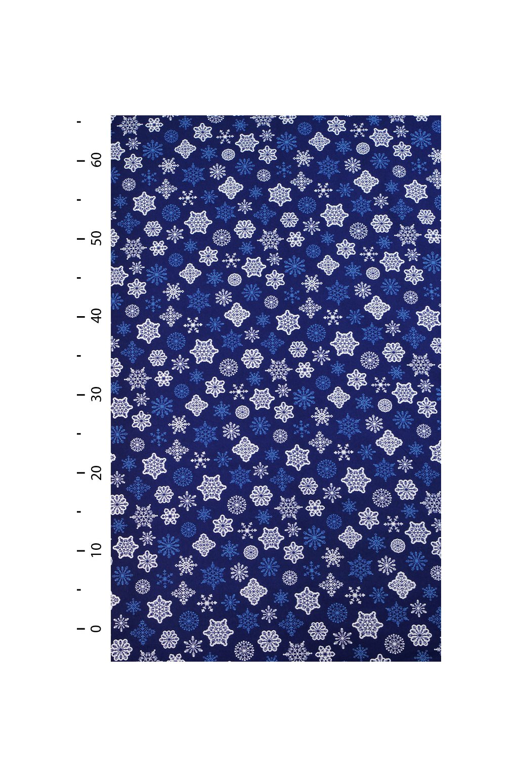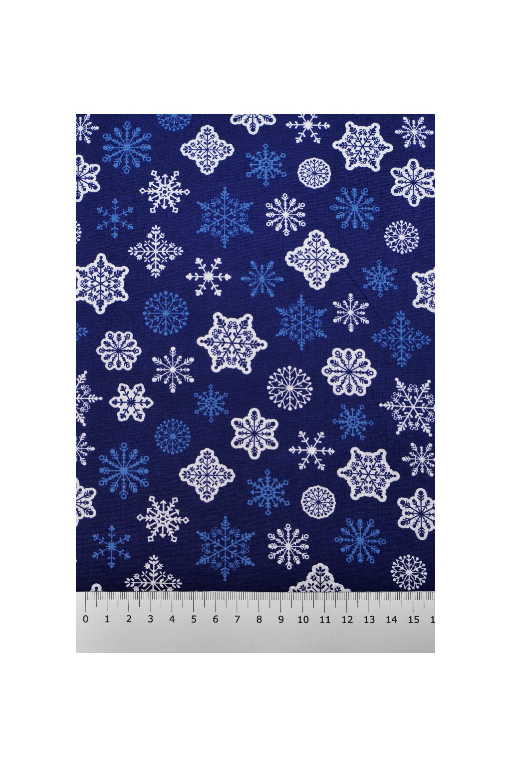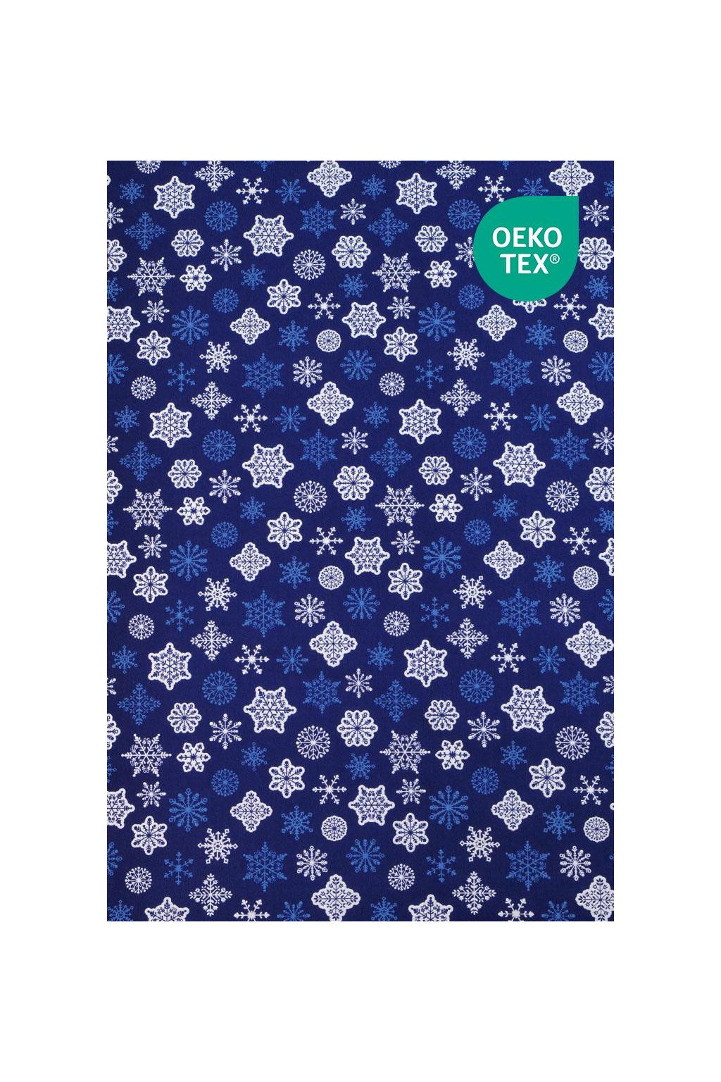 Příjemná vánoční bavlna modré barvy s motivem bílých a modrých sněhových vloček.