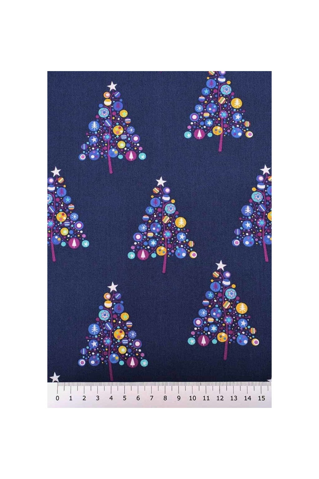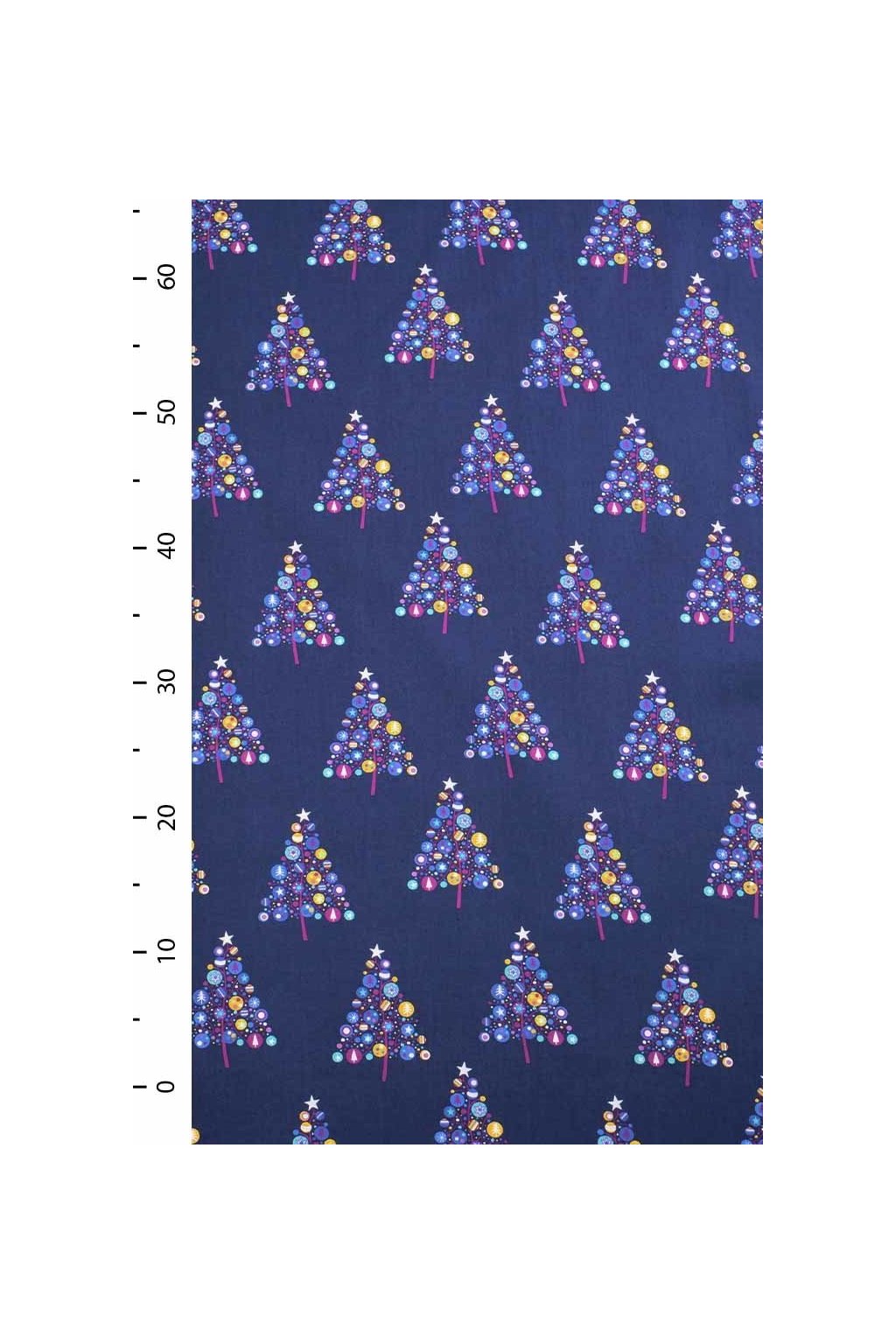 Příjemná vánoční bavlna modro-černé barvy s motivem zdobeného stromečku.