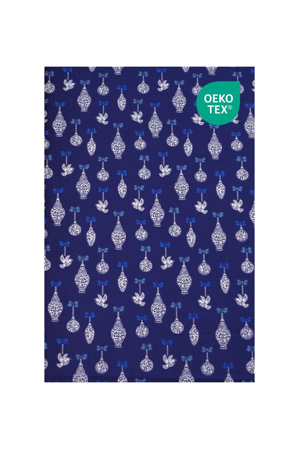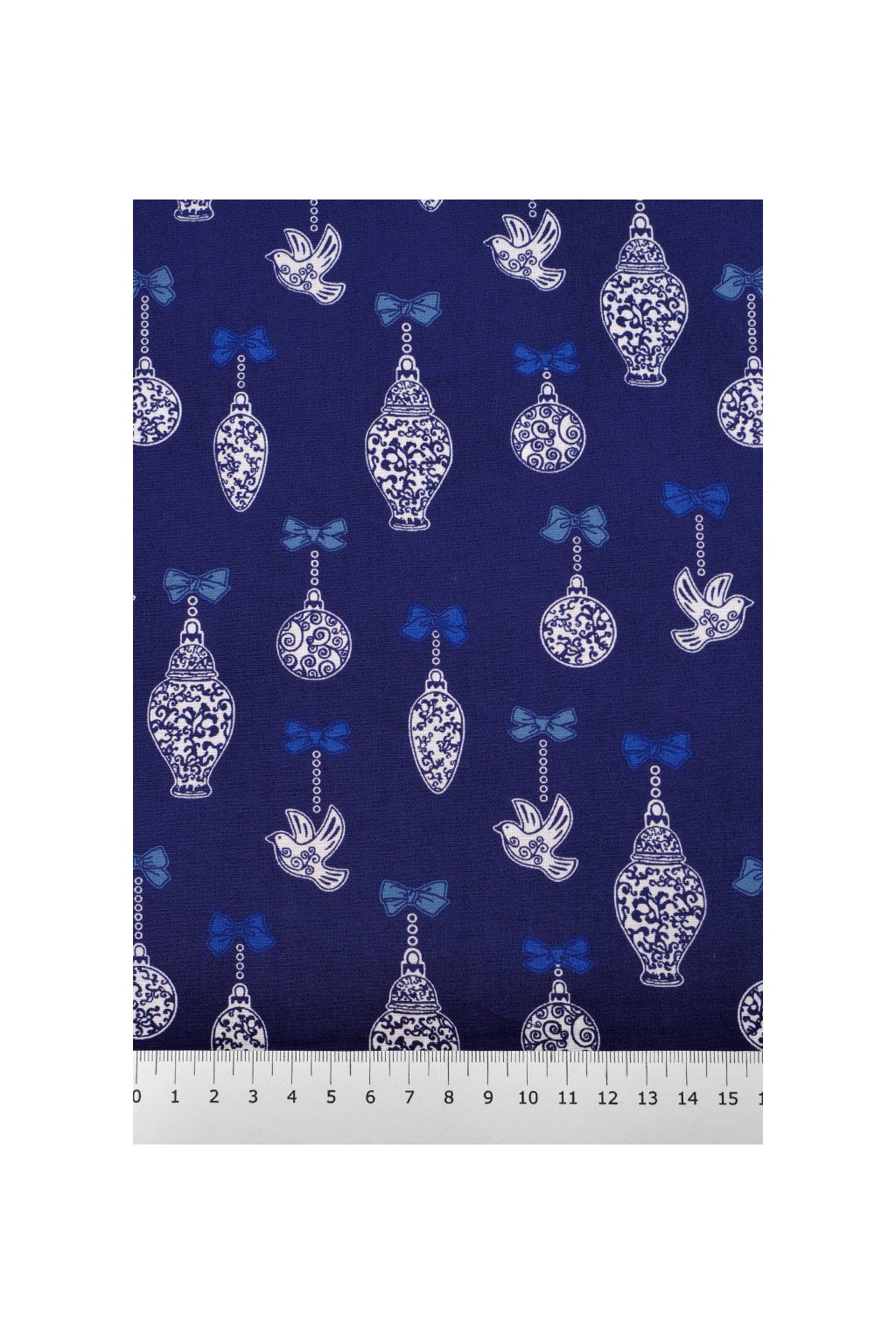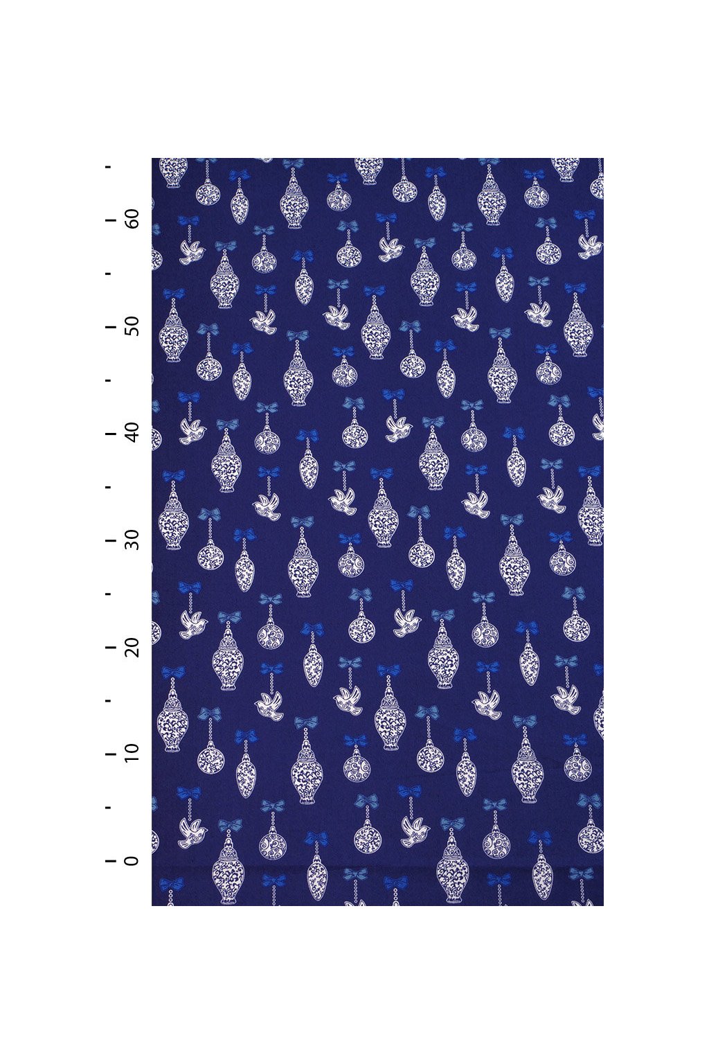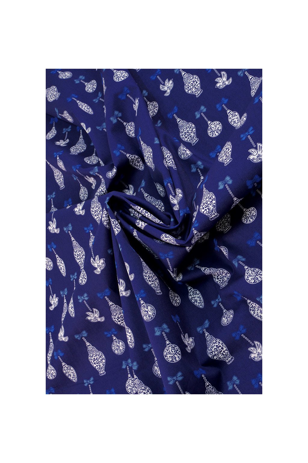 Příjemná bavlna modrobílé barvy s motivem vánočních ozdob na stromeček.