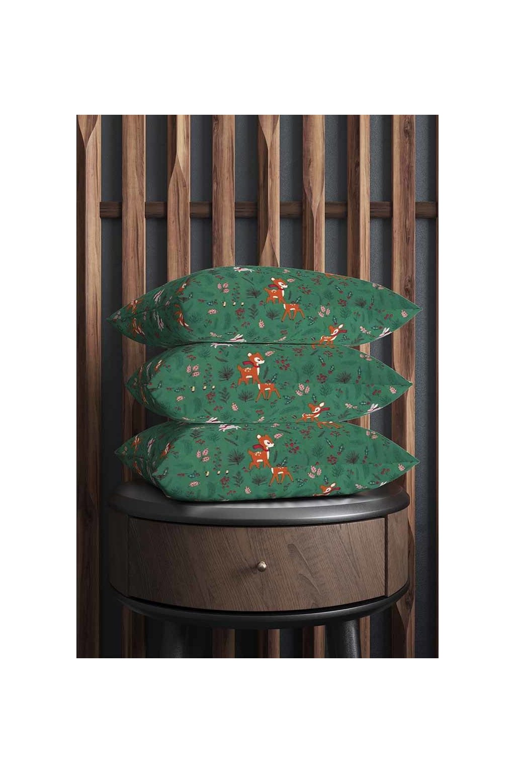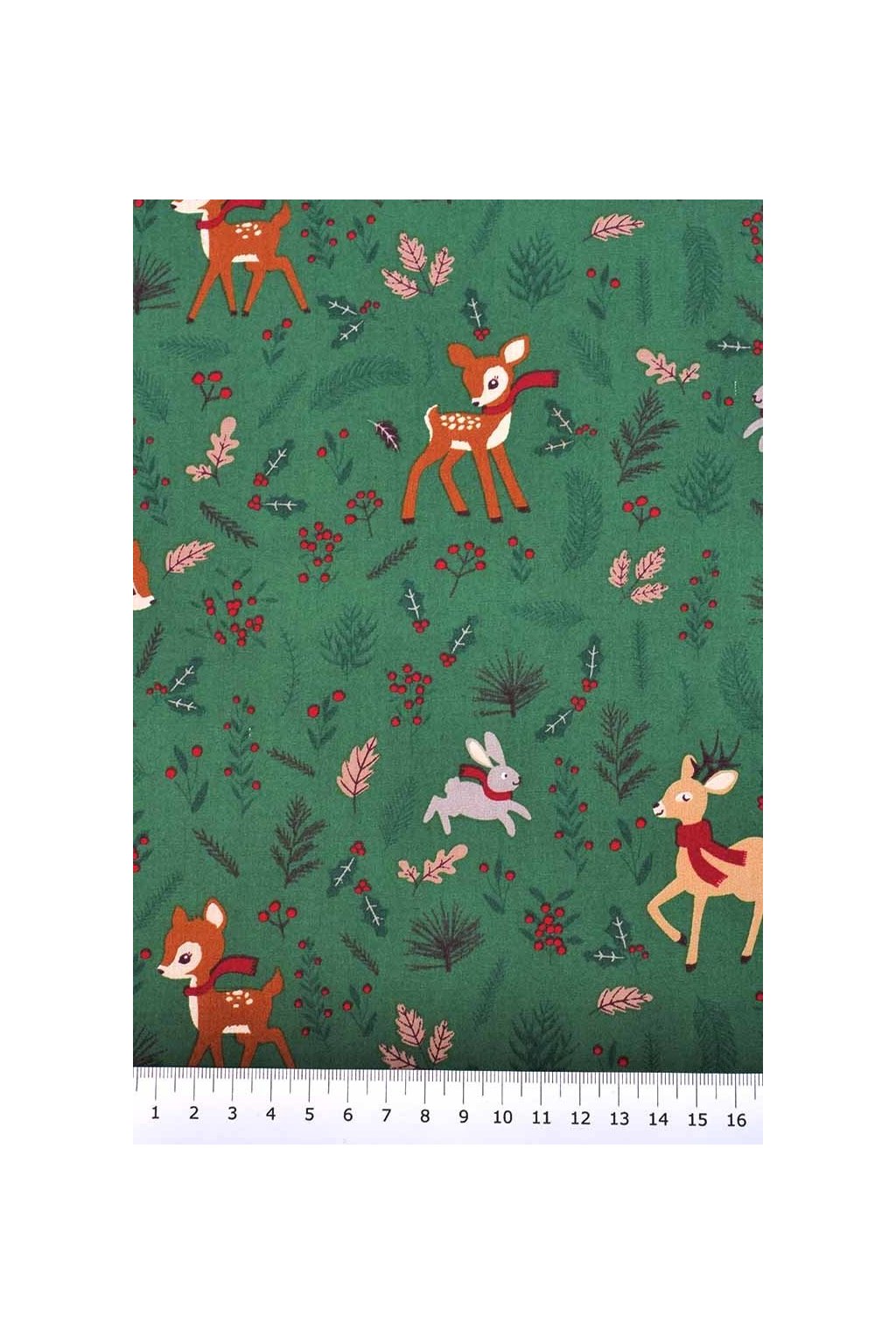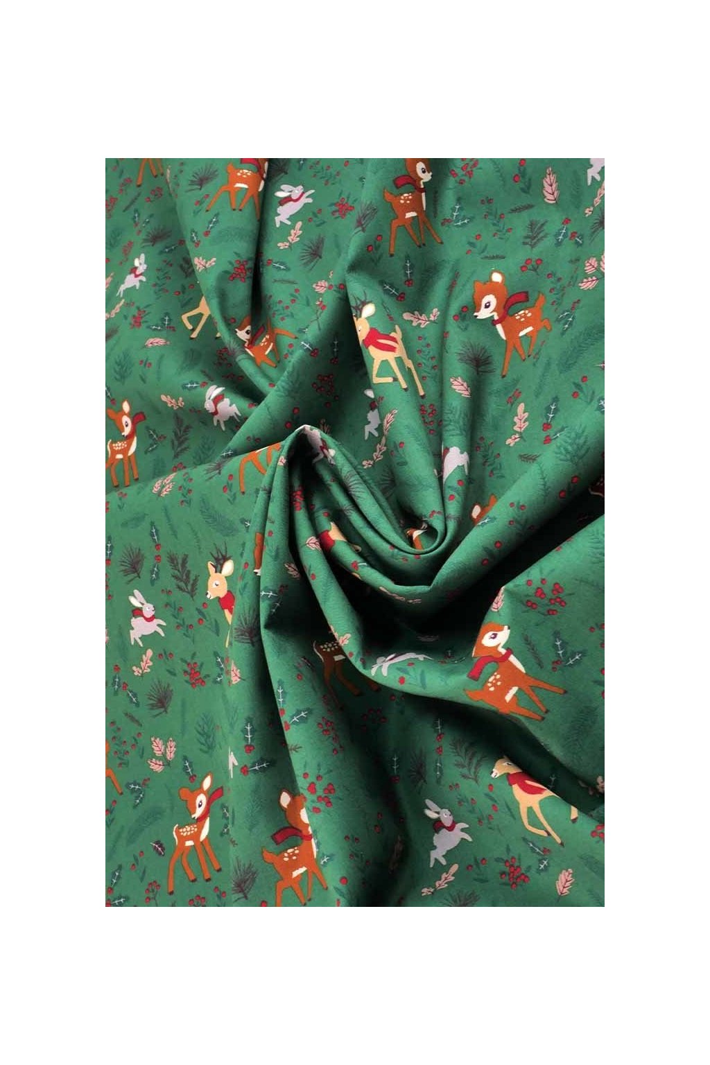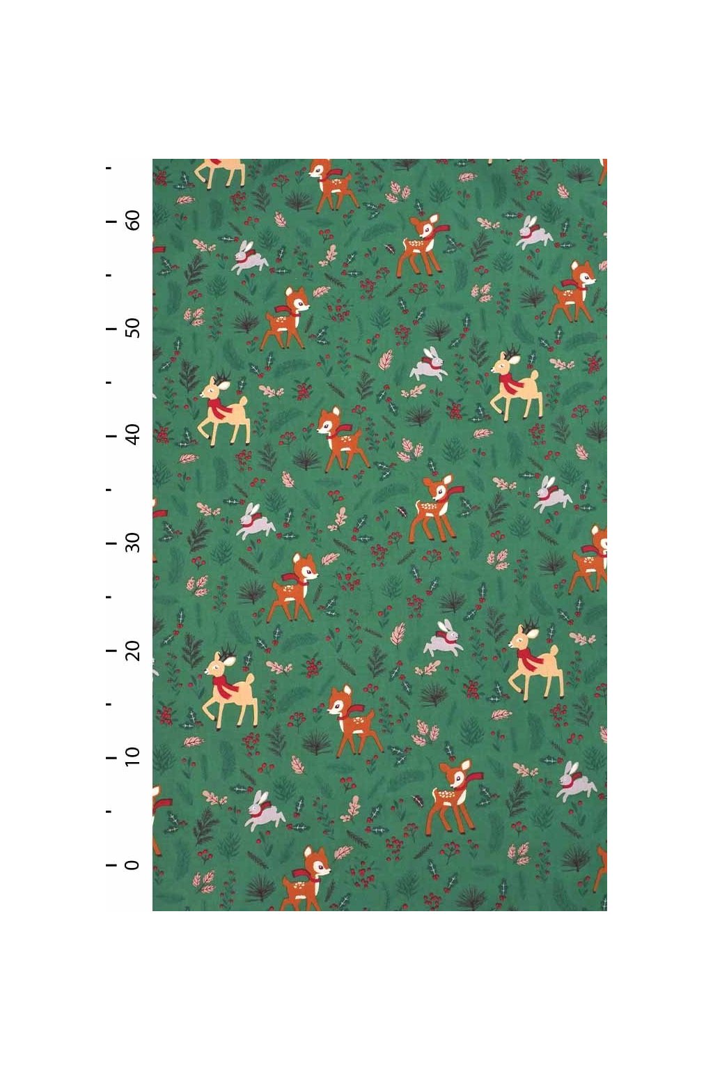 Příjemná vánoční bavlna tmavě zelené barvy s motivem listů a lesních zvířátek.
