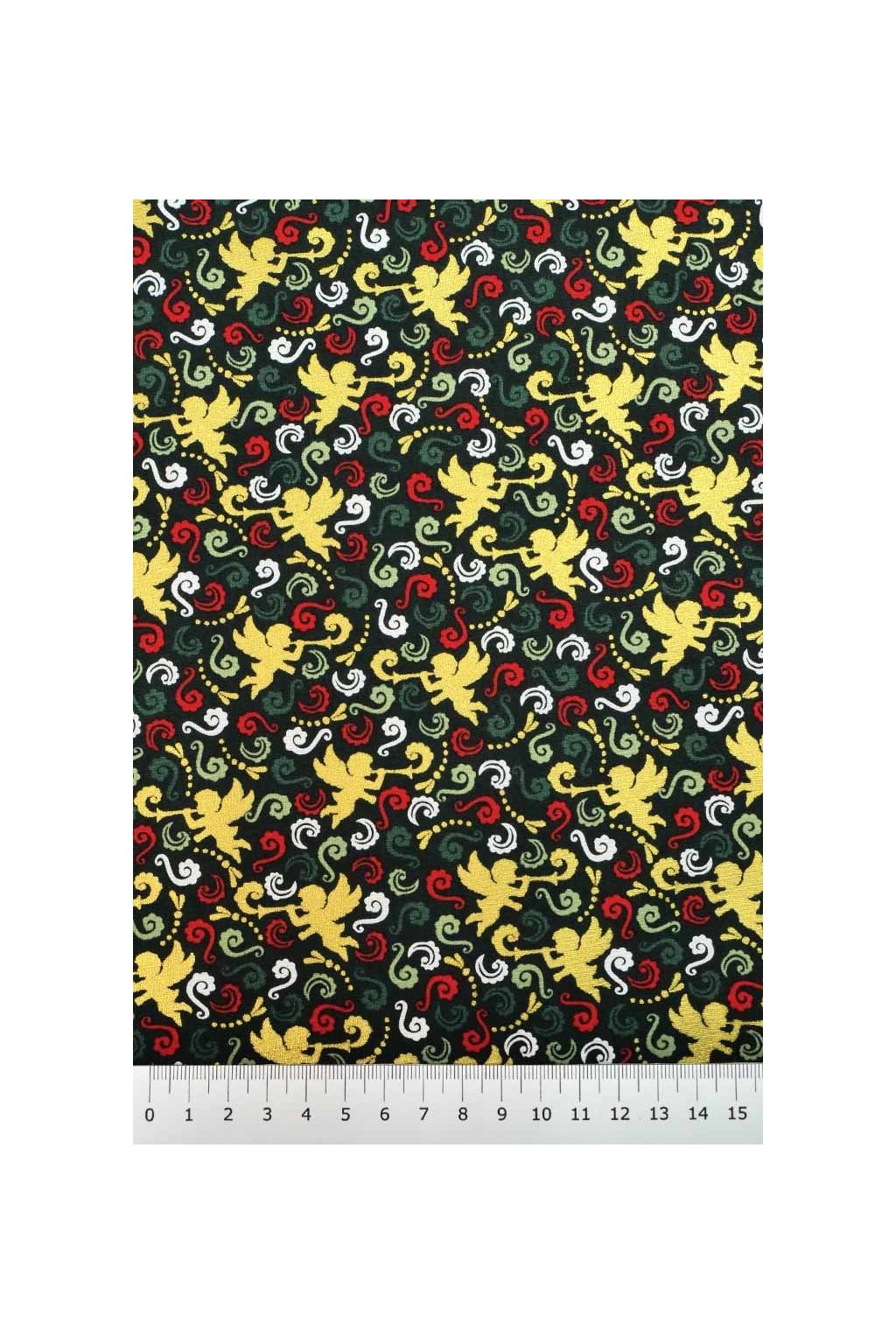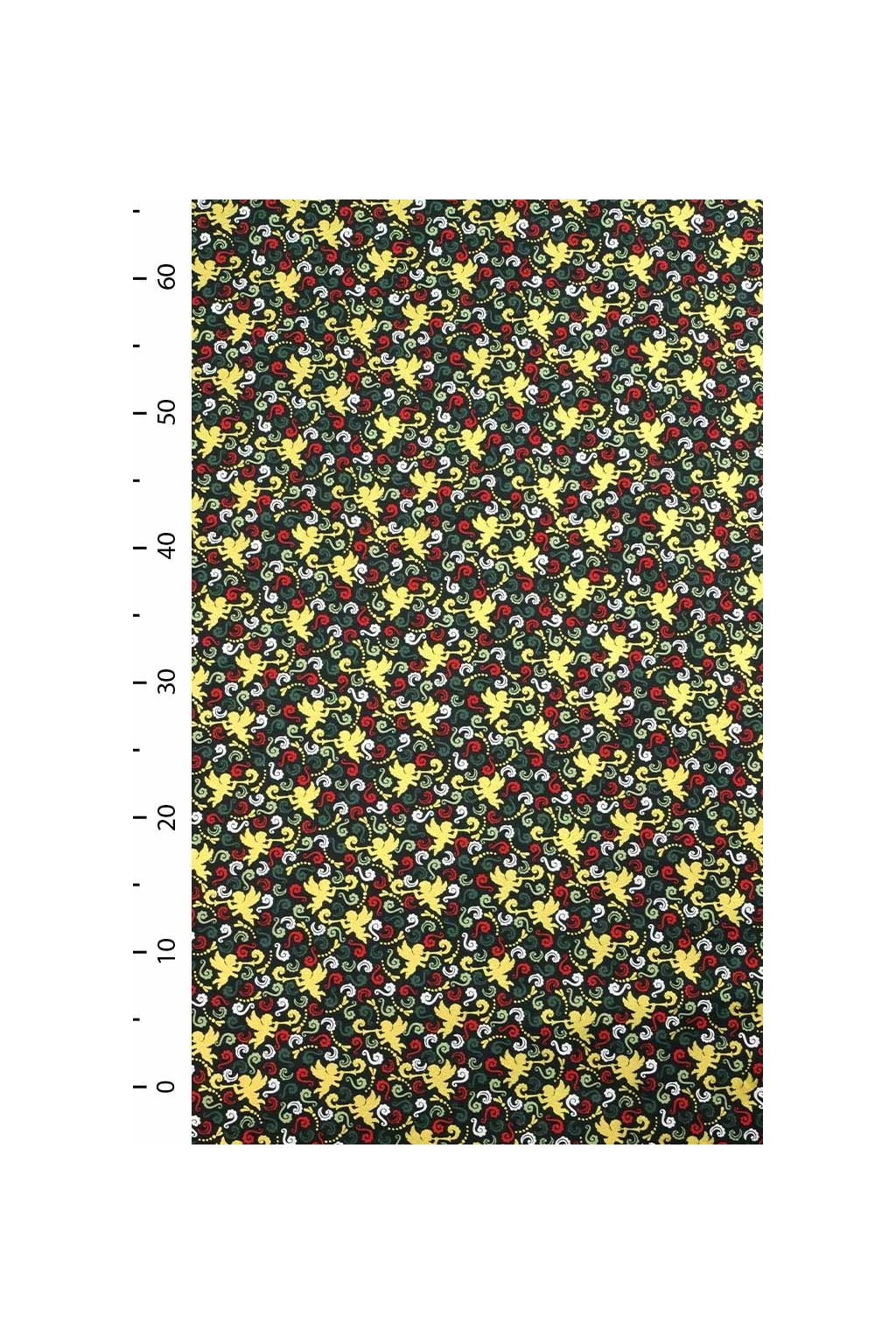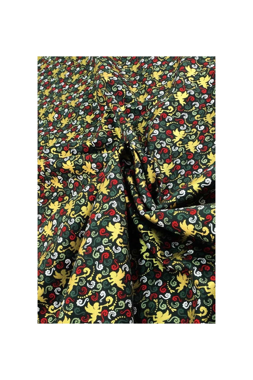 Příjemná vánoční bavlna tmavě zelené barvy s ornamentálním vzorem a zlatým andílkem.