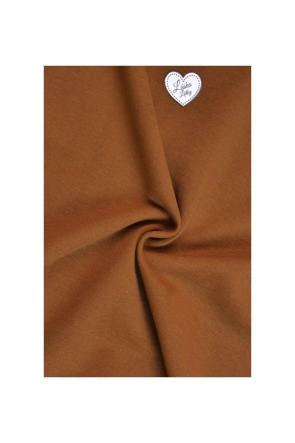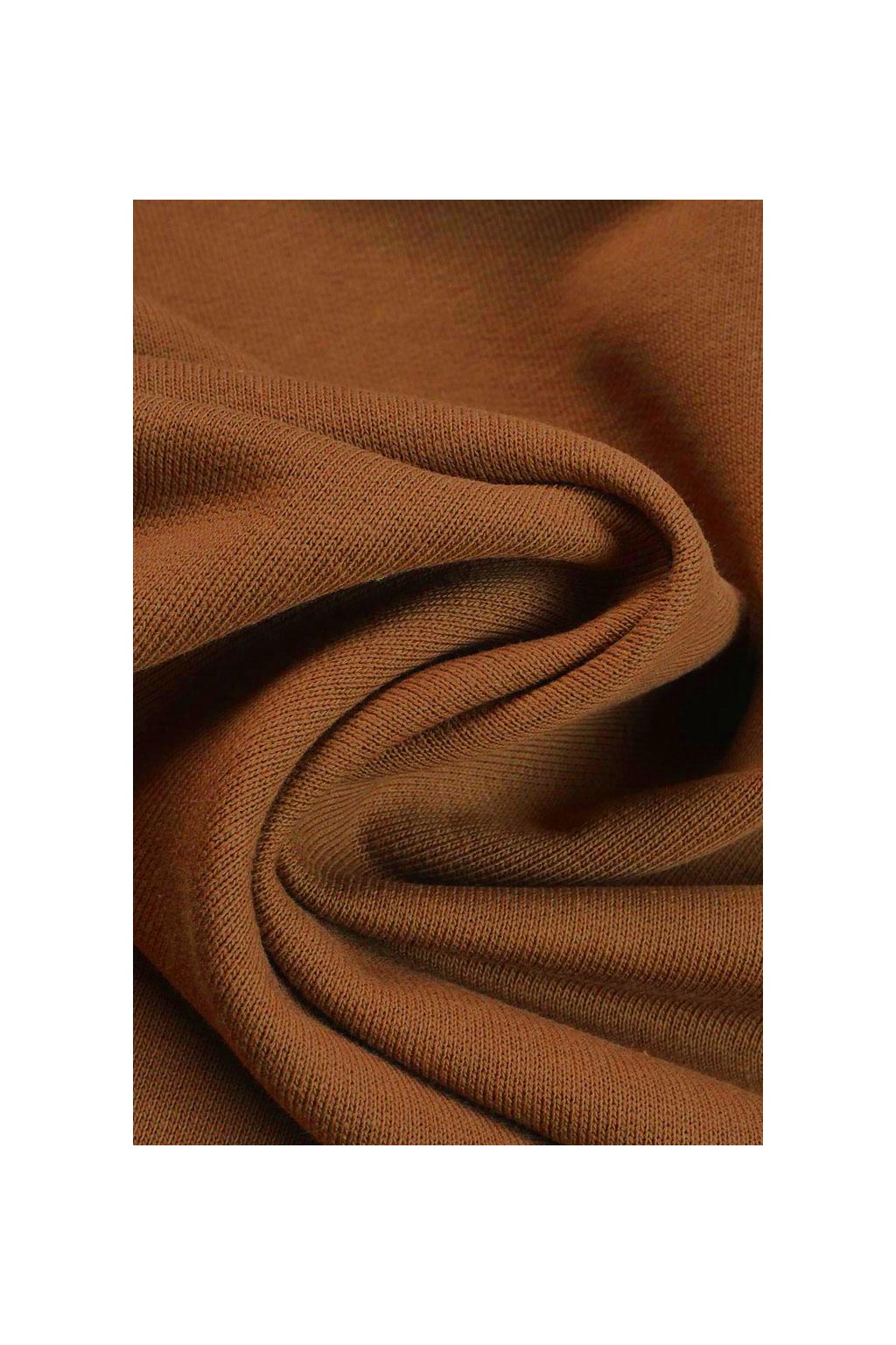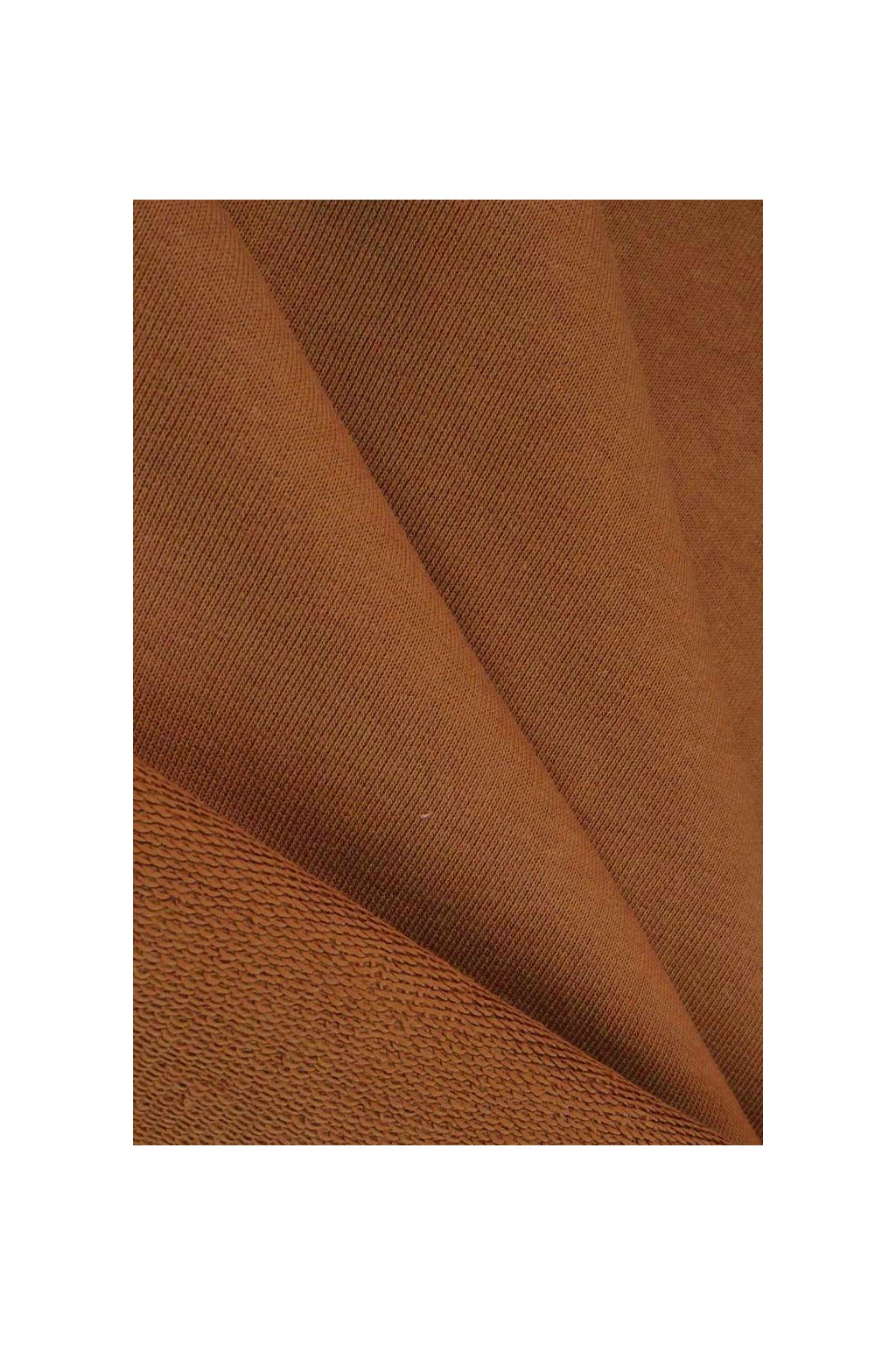 Bavlněná teplákovina (French Terry) hnědé barvy. Rub má smyčkovou strukturu.