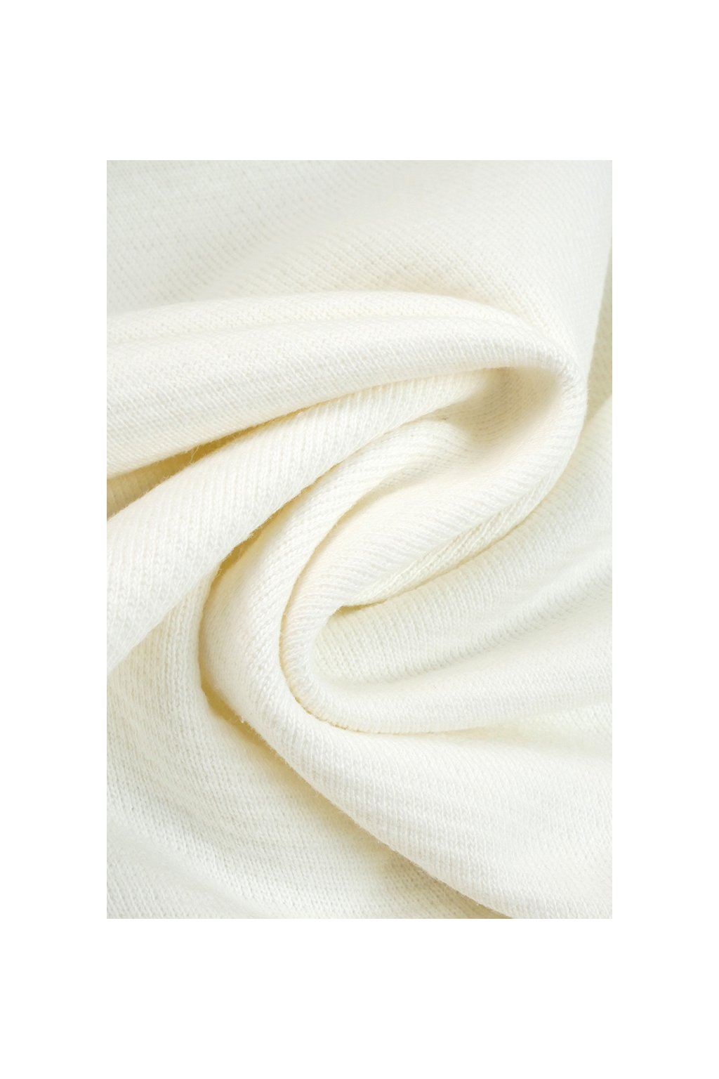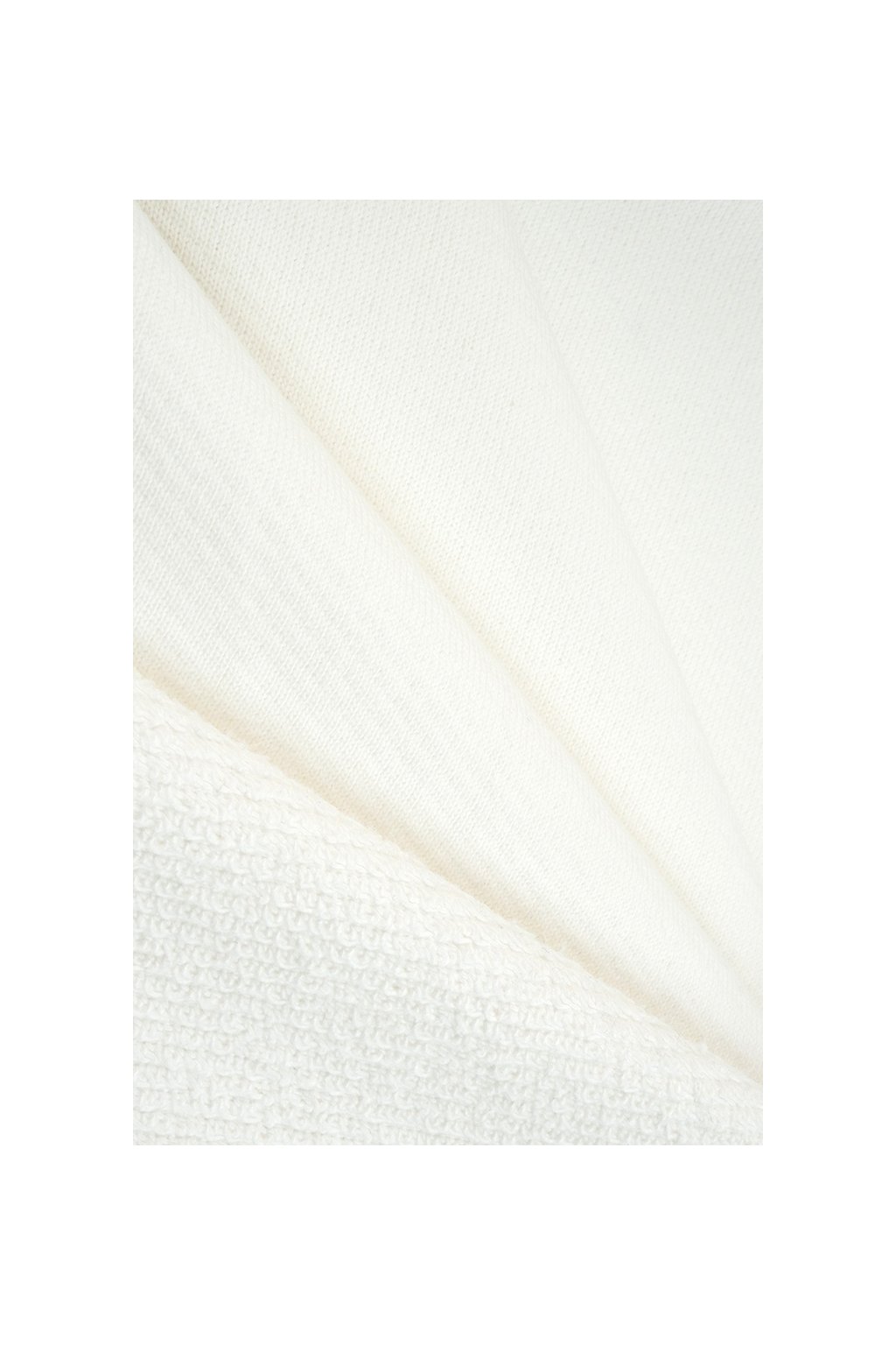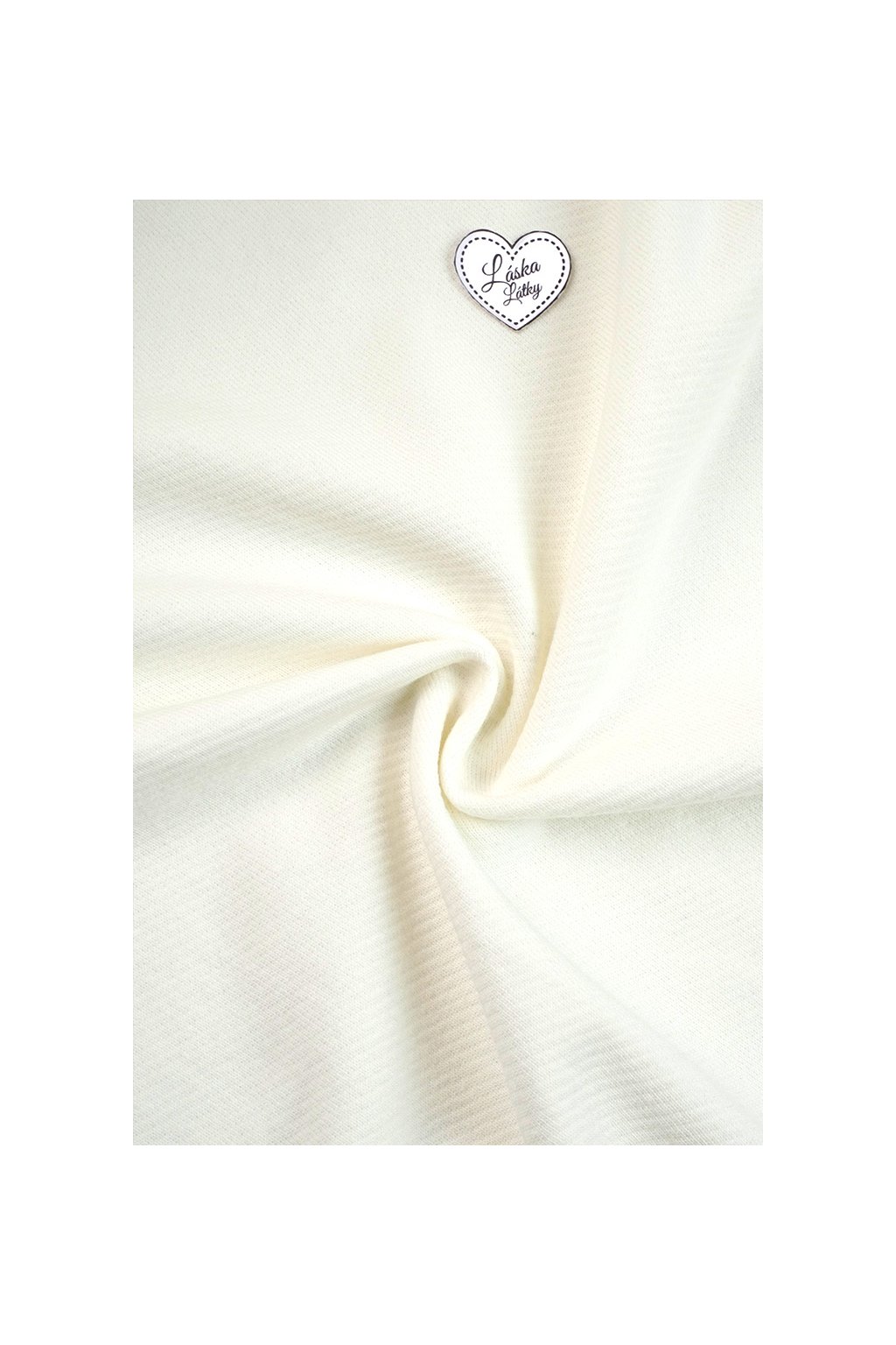 Bavlněná teplákovina (French Terry) lomené bílé barvy. Rub má hrubší smyčkovou strukturu.