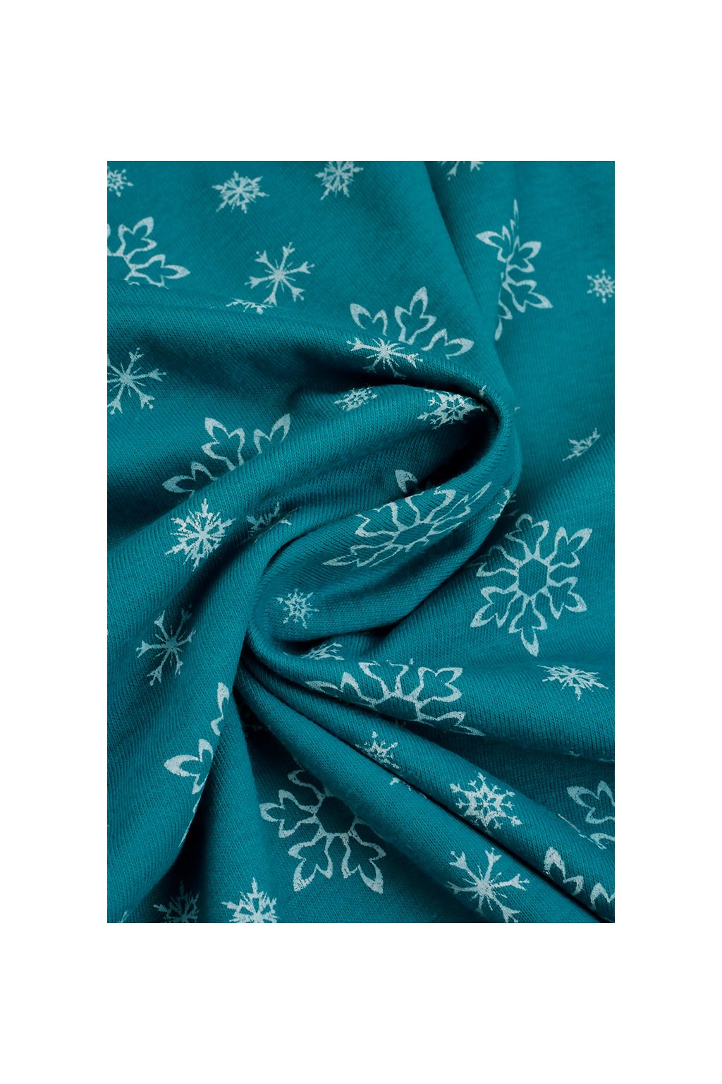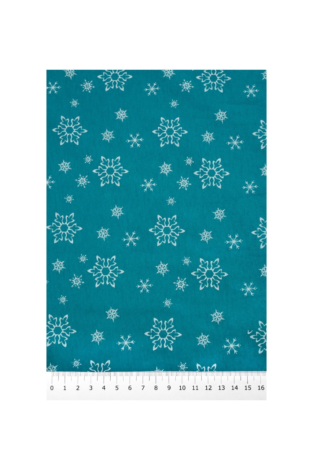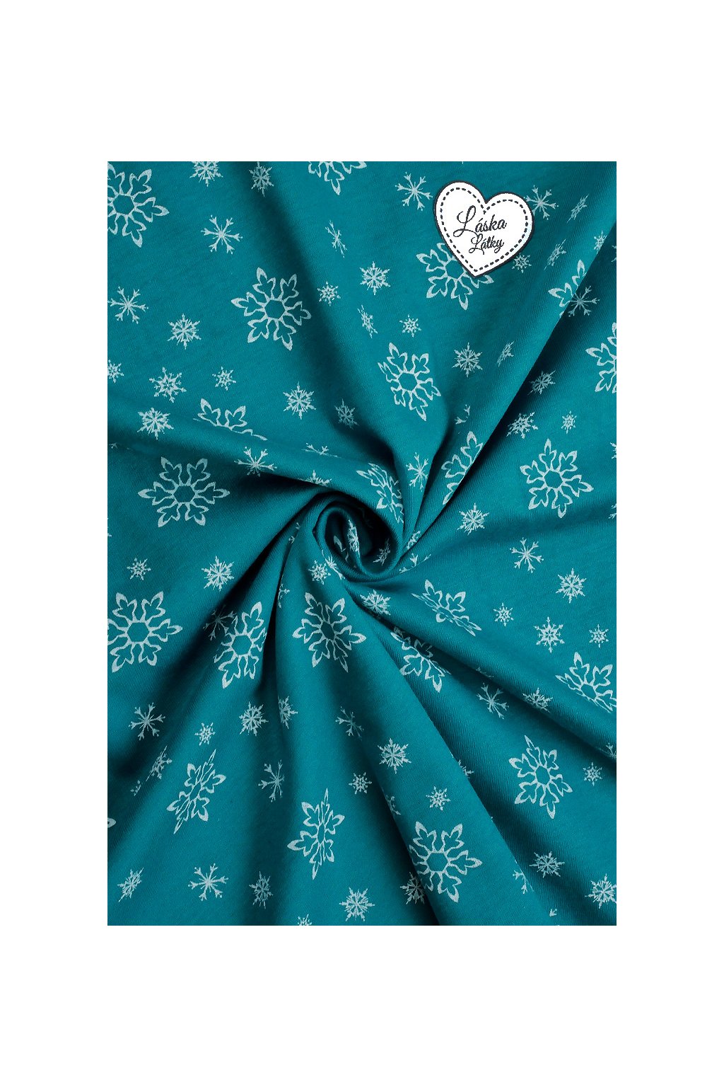 Elastický úplet v petrolejové barvě s vánočním vzorem vloček.